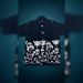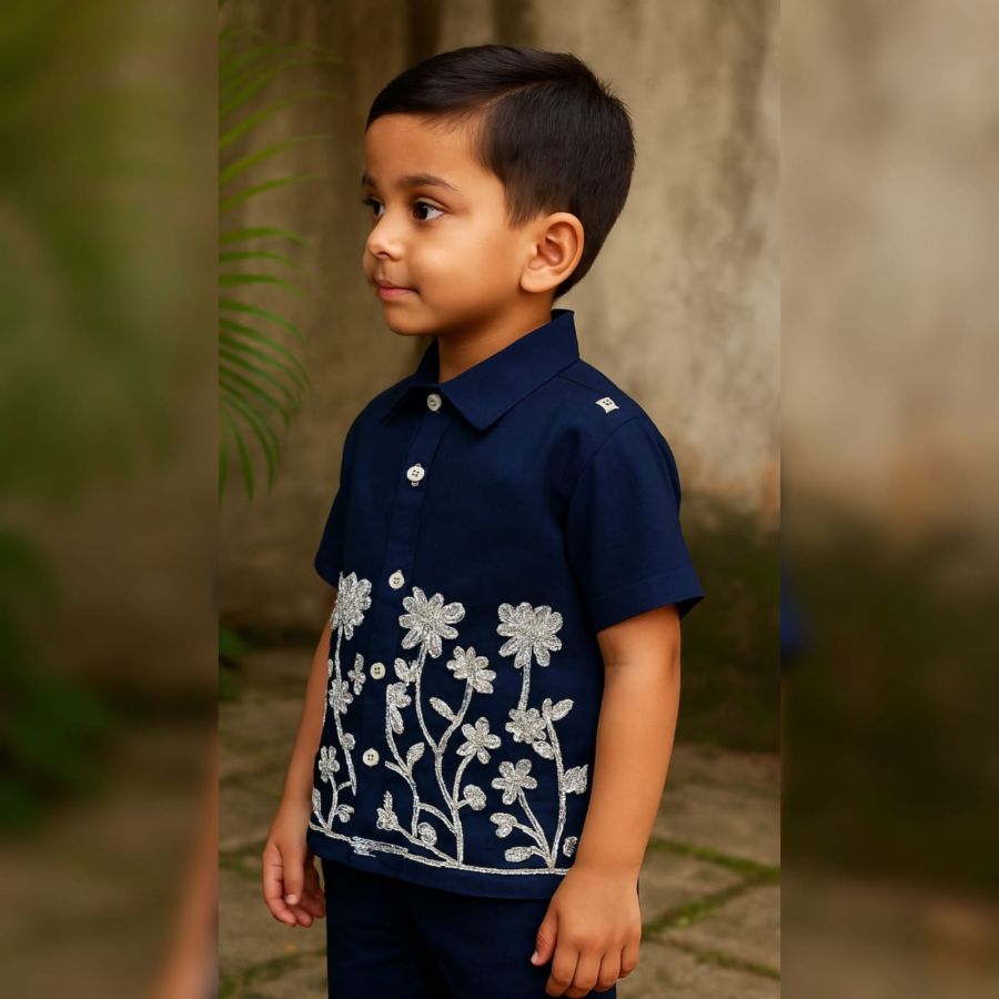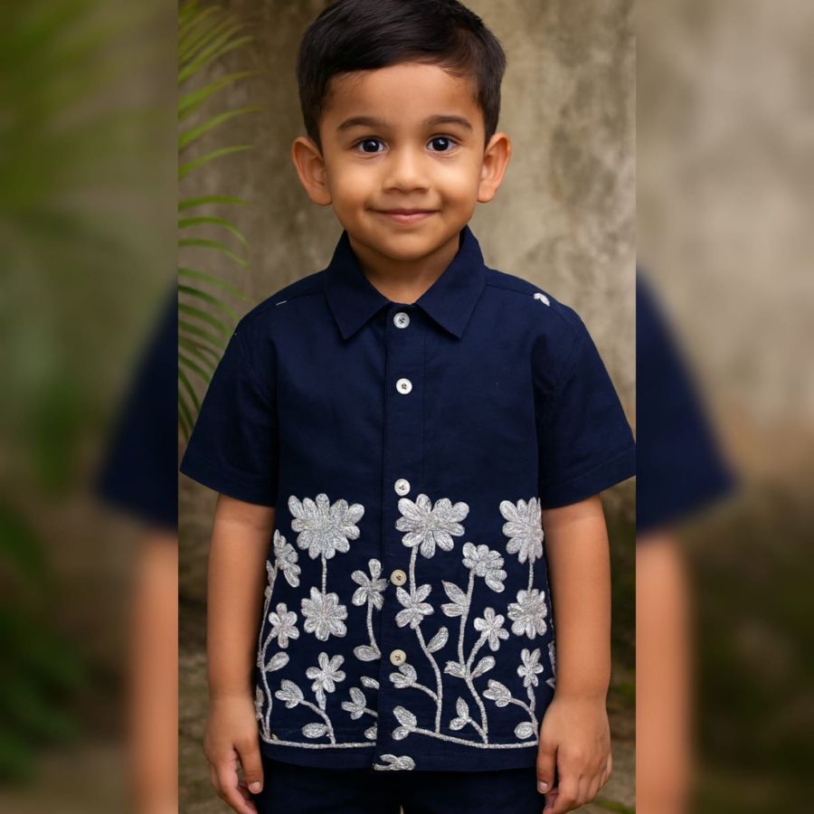 That is a striking shirt! The high-contrast silver embroidery against the deep black fabric gives it a very distinct, "artisan-meets-modern" vibe. It looks like a short-sleeved button-down with a floral border motif, which is quite popular in contemporary ethnic and resort wear.