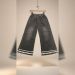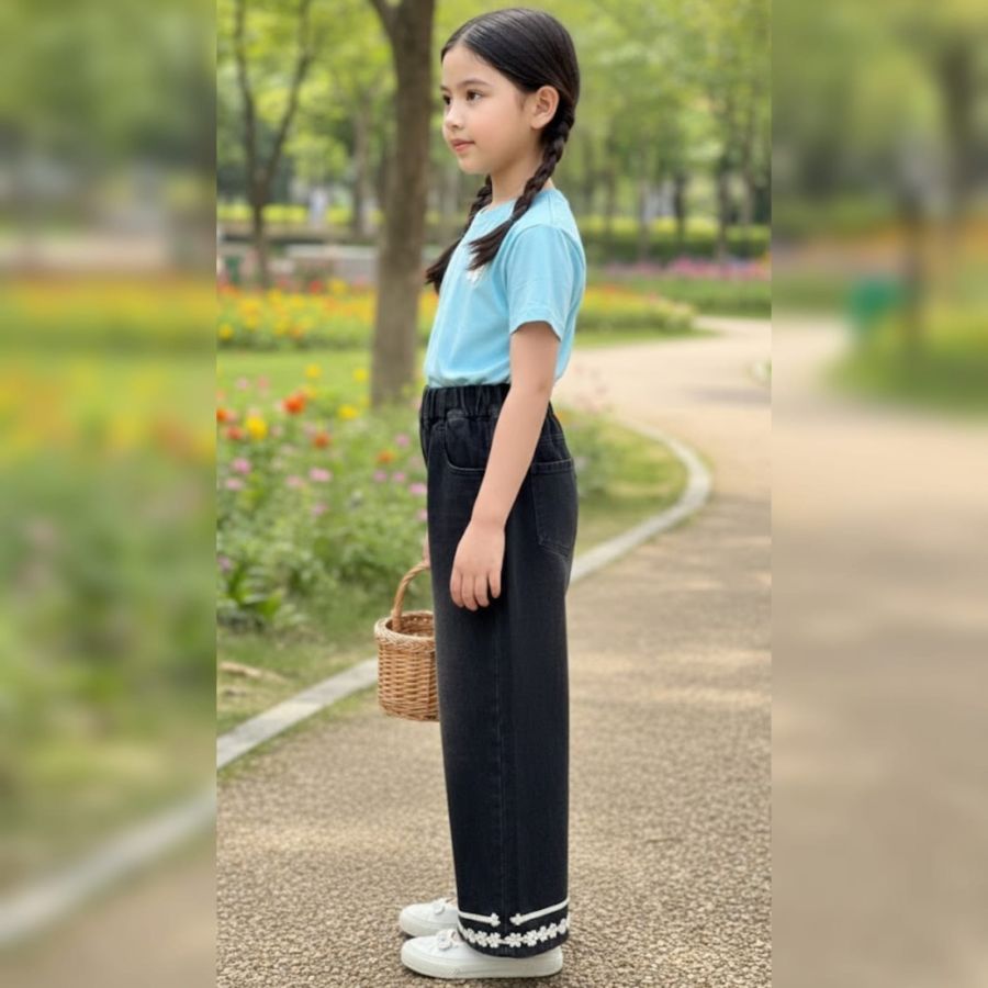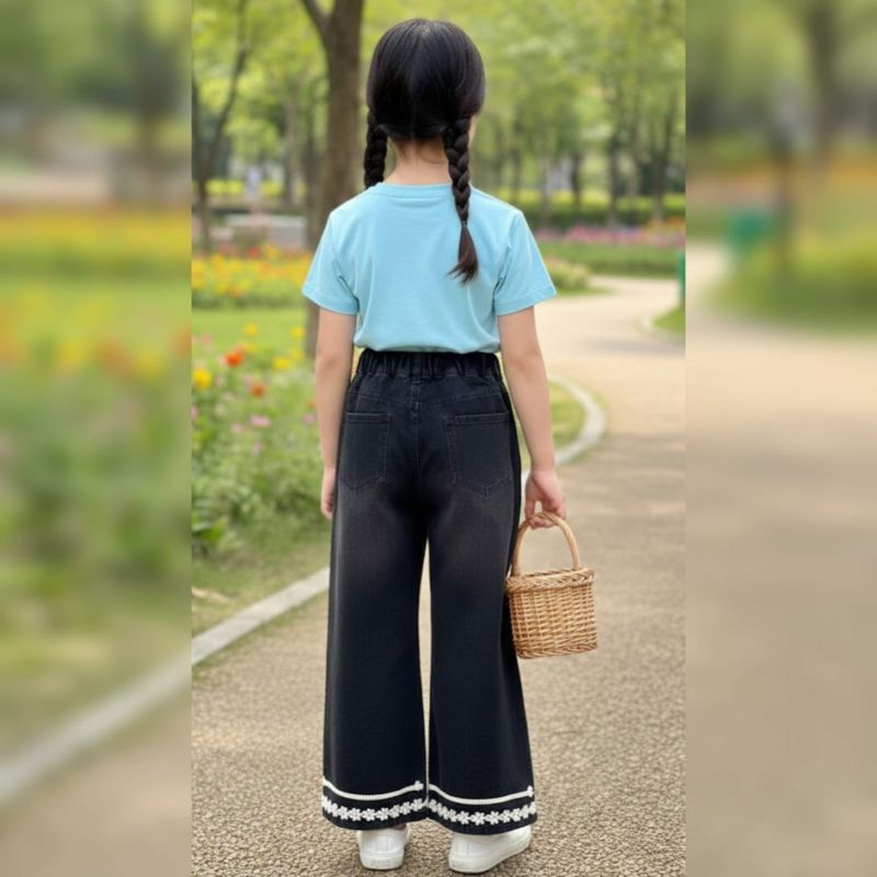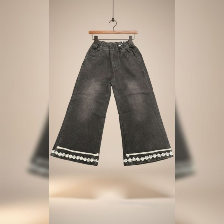 These are a pair of girls' wide-leg jeans featured in a washed black or charcoal gray denim. The style is casual yet playful, characterized by a relaxed fit through the leg and a comfortable elasticized waistband.