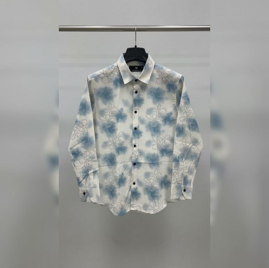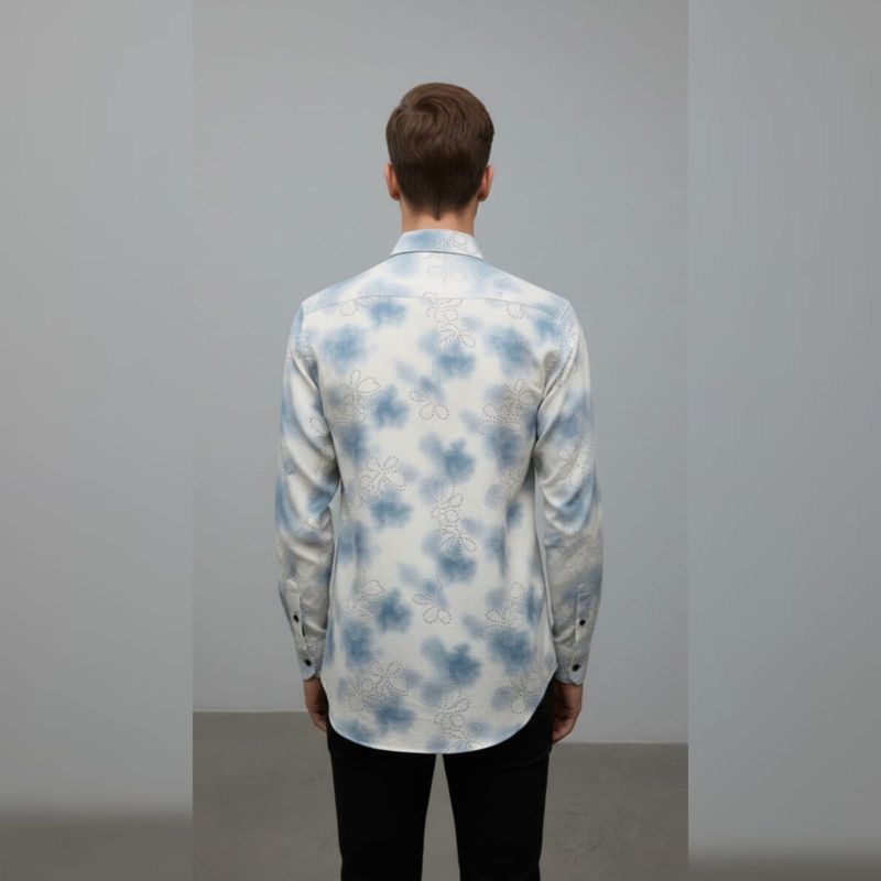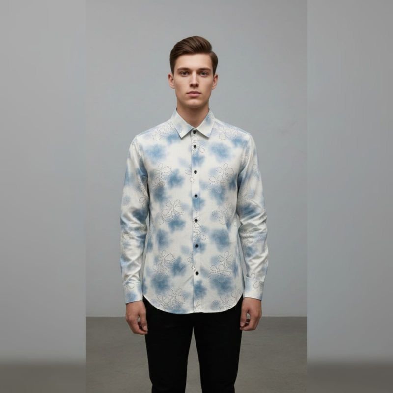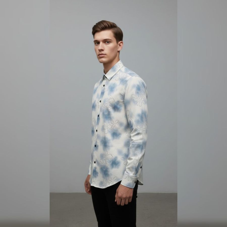 Print Style: A blue watercolor or "cloud" wash on a crisp white background. It gives off a relaxed, airy vibe similar to traditional shibori or modern tie-dye.