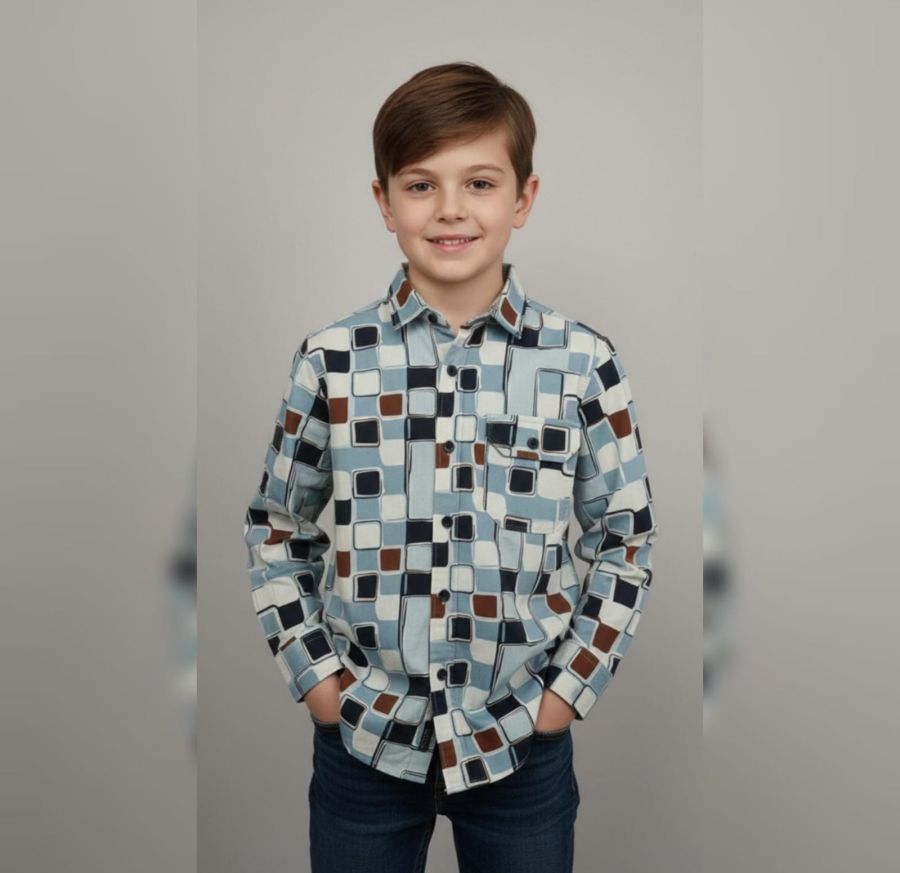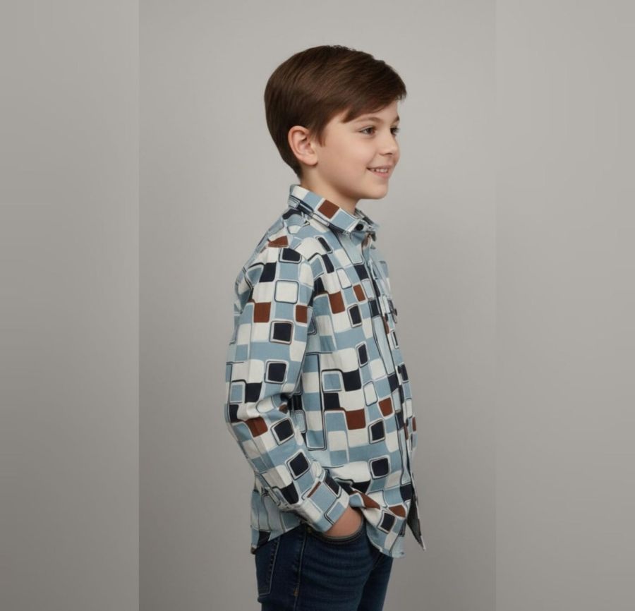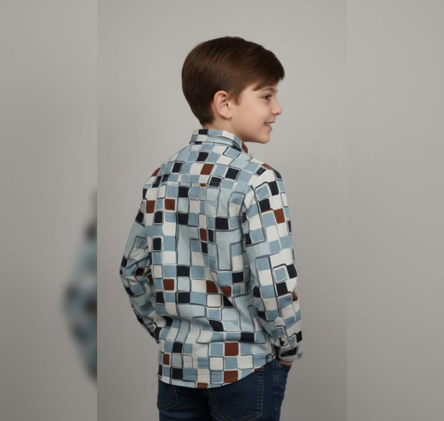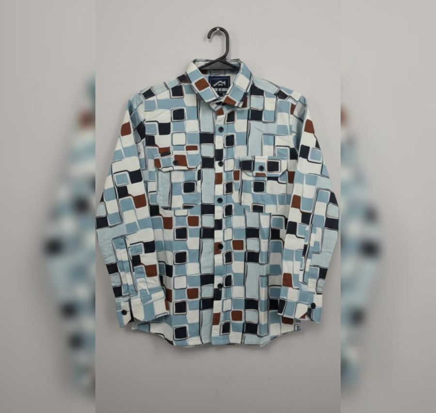 That is a bold, mid-century modern inspired button-down. The geometric "mod" pattern and the mix of cool blues with earthy brown accents give it a very distinct retro-vintage vibe.