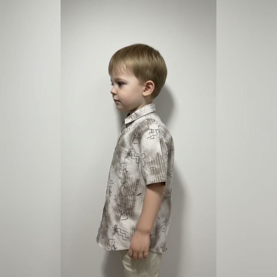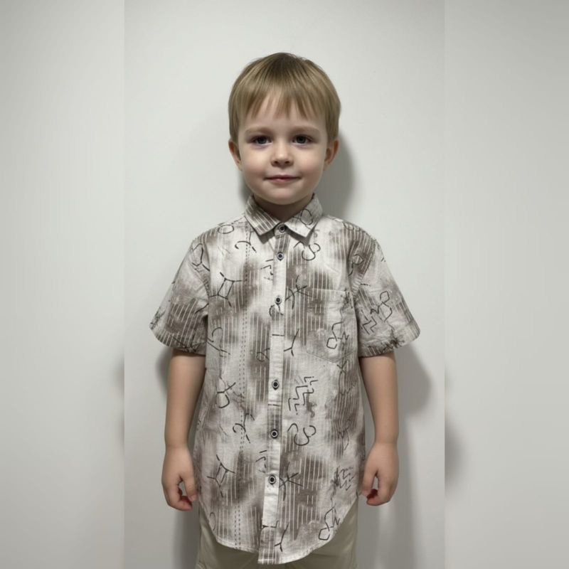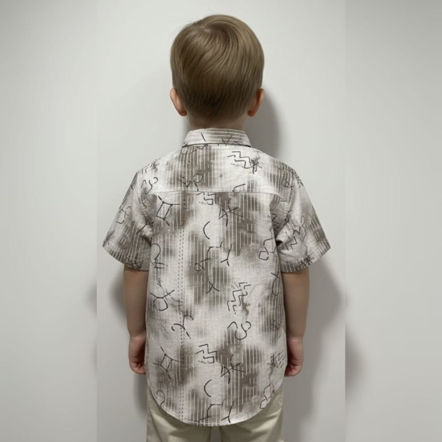Color Palette: It uses a neutral, earthy palette consisting of cream, beige, and charcoal grey, making it easy to pair with various pants (like the khaki ones shown).