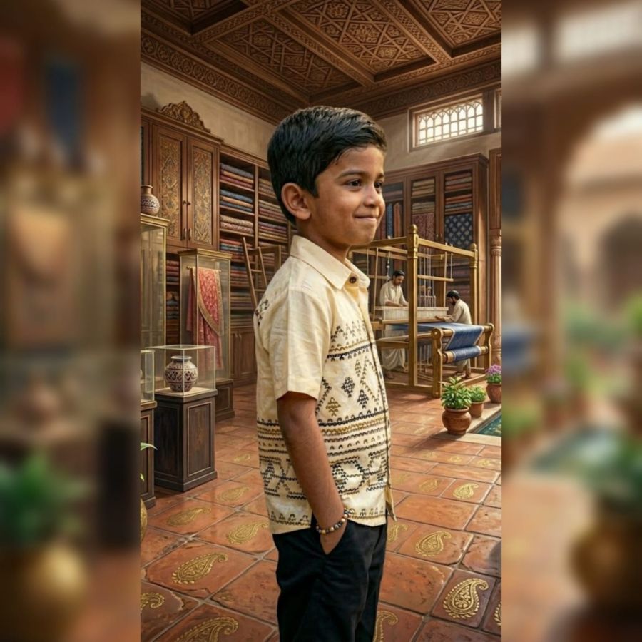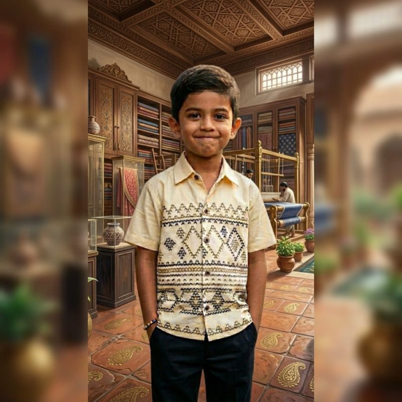 That is a striking image! It looks like a masterclass in artisanal craft. The shirt itself features intricate, geometric patterns—likely inspired by block printing or traditional embroidery—set against a cream or off-white fabric that has the texture of hand-loomed linen or cotton.