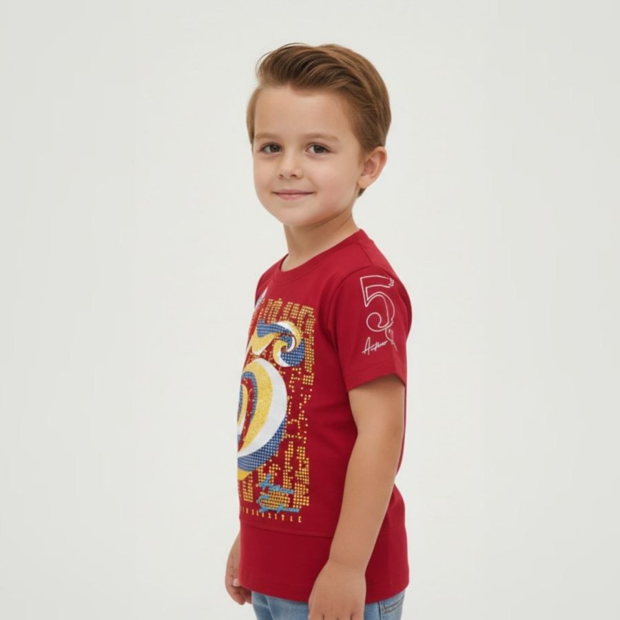 That is a vibrant choice! Red is a high-energy color that usually stands out in any crowd. The shirt you've shared has a distinct "urban streetwear" vibe with its graphic "5" design and patchwork-style labels.