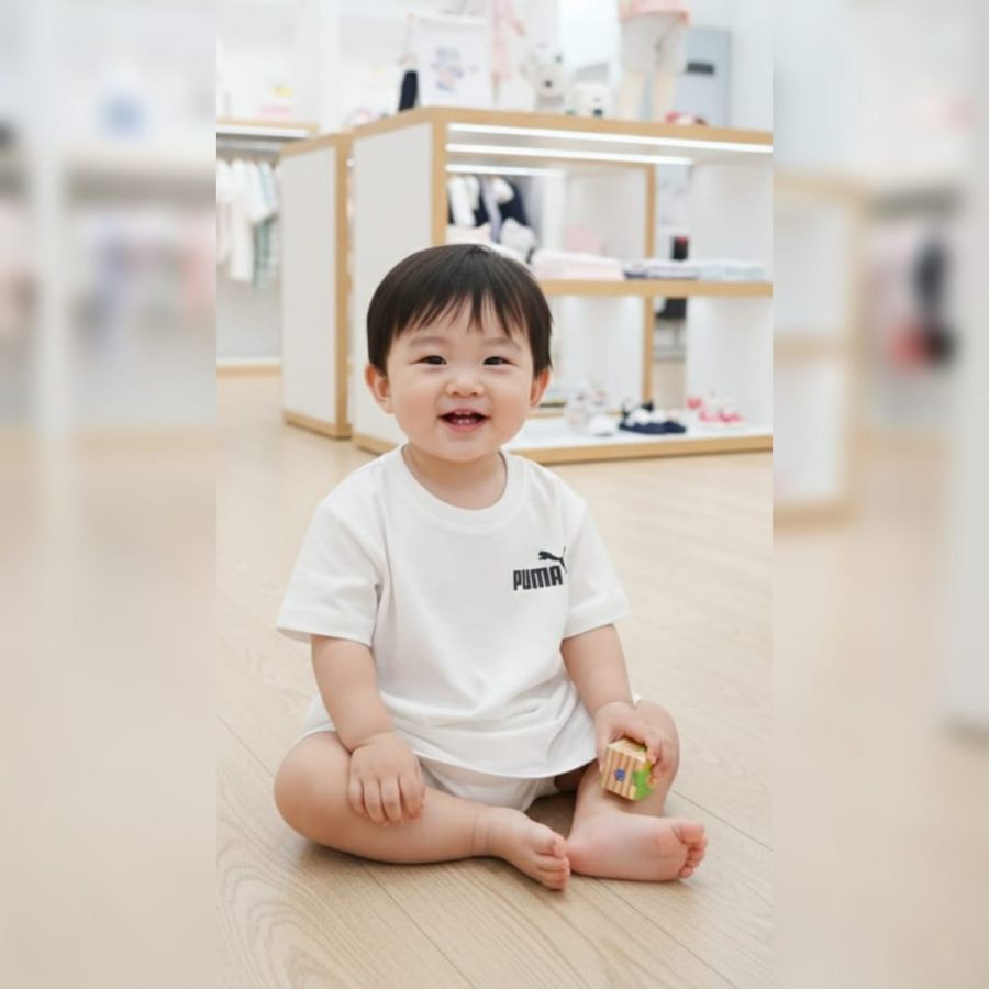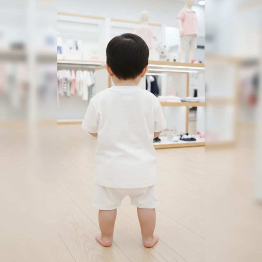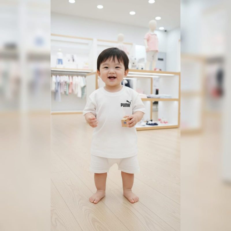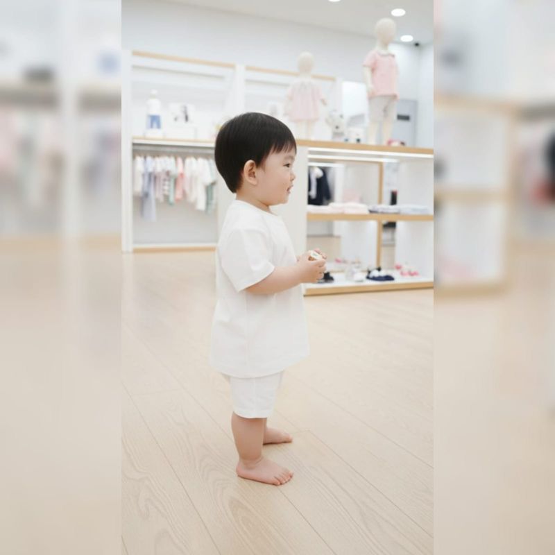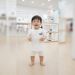 This is a full-body photograph of a happy toddler standing in the middle of a brightly lit children's clothing store. The child is facing the camera with a wide, joyful smile, looking directly at the viewer.