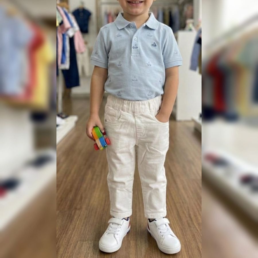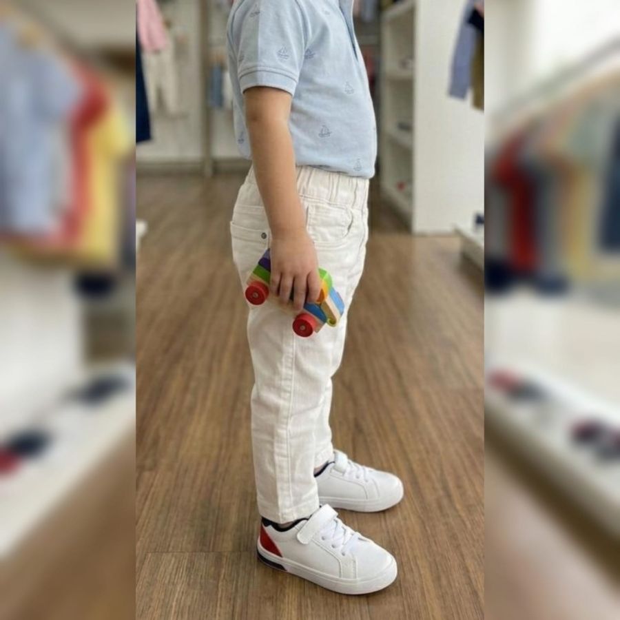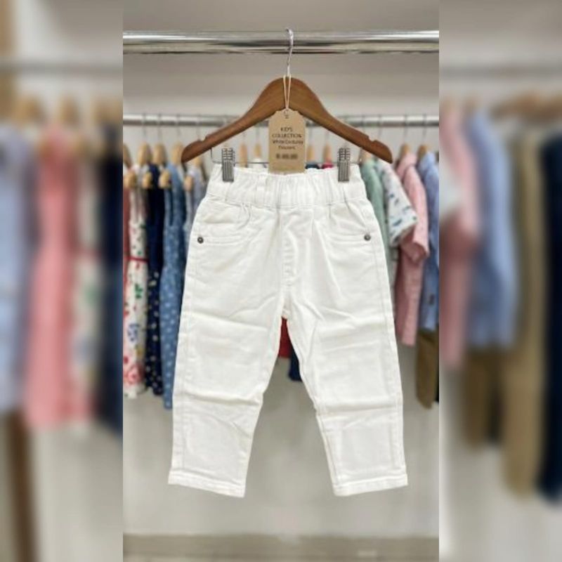 That's a sharp-looking pair of kids' trousers! They look like white corduroy or heavy cotton, featuring an elasticated waistband—perfect for both comfort and a clean, formal look.