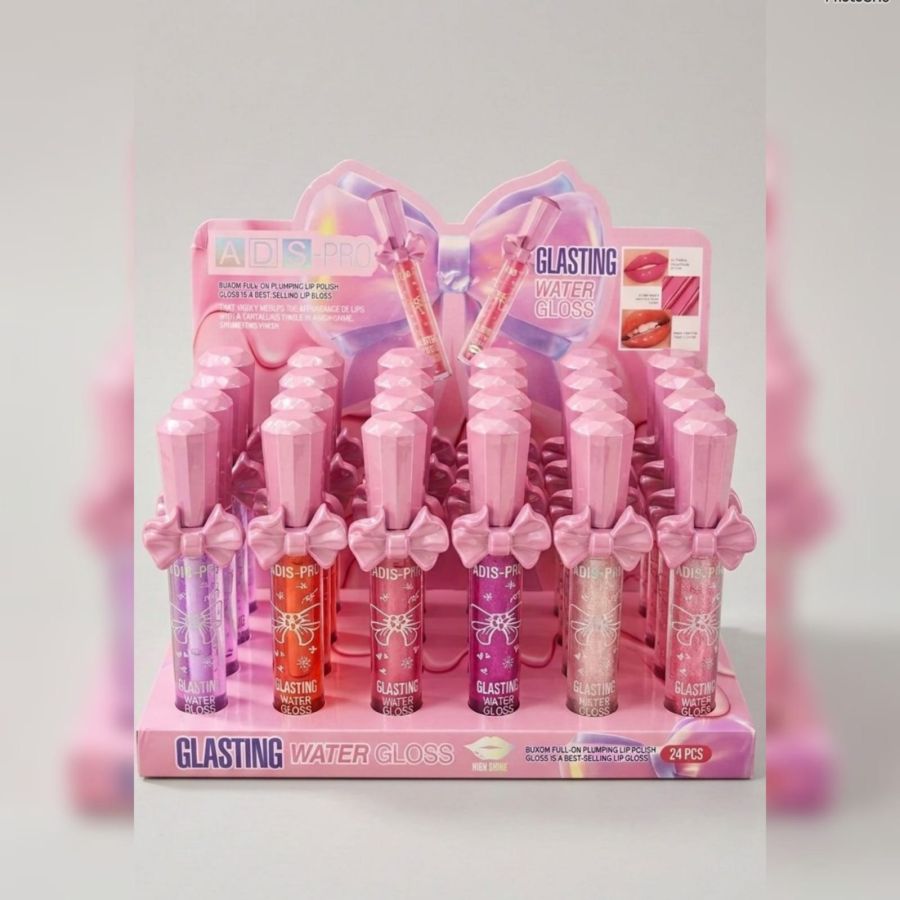 A set of ADS-PRO Glasting Water Gloss, a plumping lip polish. It looks like a bulk retail pack containing 6 individual glosses in various shimmering shades.