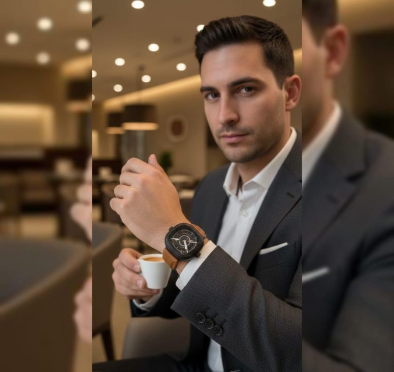 Elevate your everyday style with the Aero-Graph. This timepiece features a bold, minimalist square dial with a unique "cockpit-style" display, housed in a matte black industrial frame.