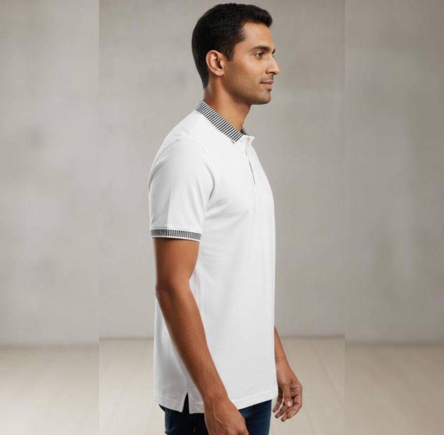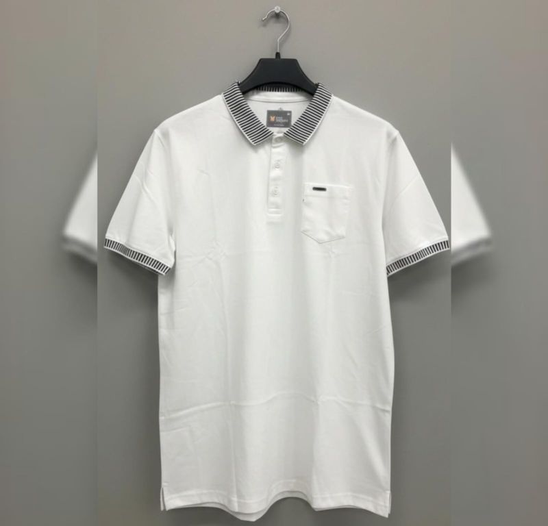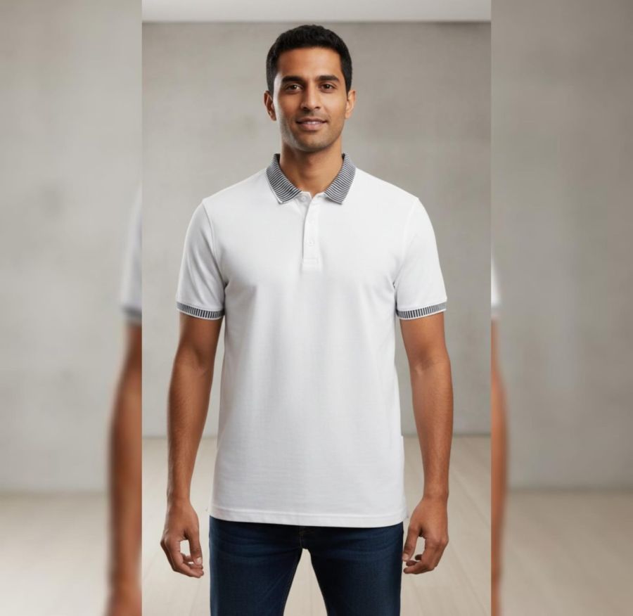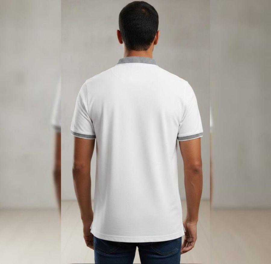 A classic wardrobe essential with a modern twist. The Alpine Stripe Polo features a crisp white body accented by sophisticated monochrome striped ribbing on the collar and sleeves. Complete with a functional chest pocket and a subtle metallic branding tab, this polo offers a sharp, tailored silhouette for the modern man.