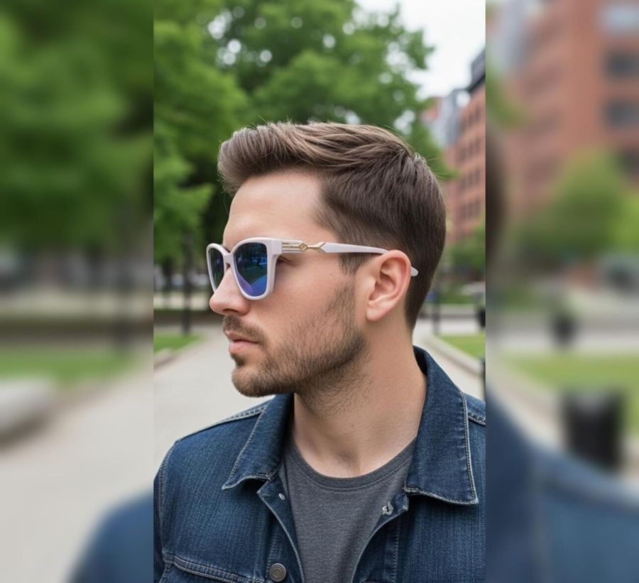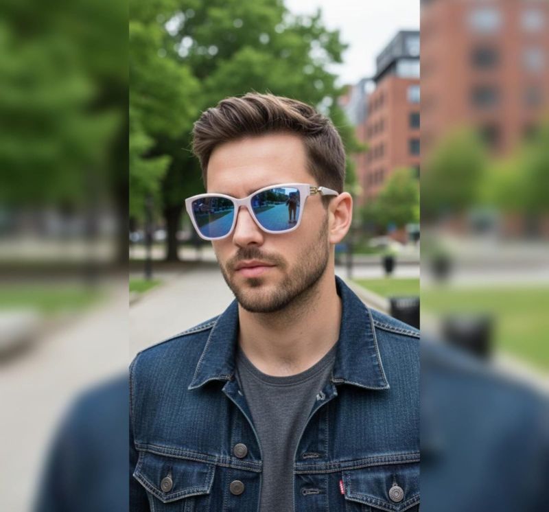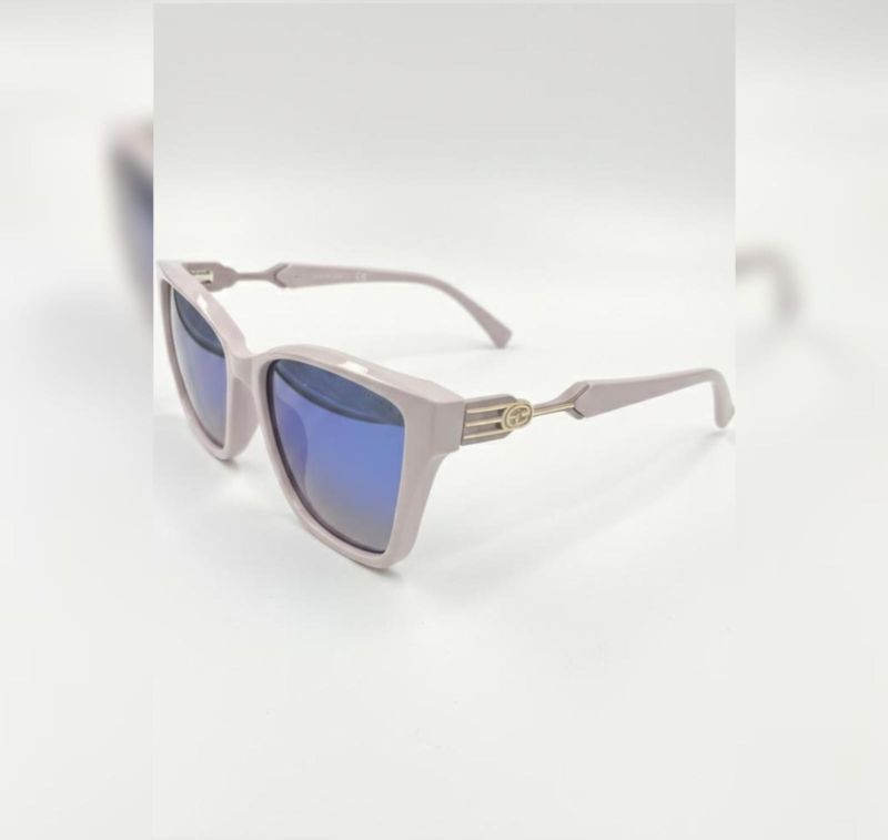 Elevate your style with the Aura Gloss collection. These sunglasses feature a sleek, lilac-grey oversized frame paired with striking blue mirrored lenses.