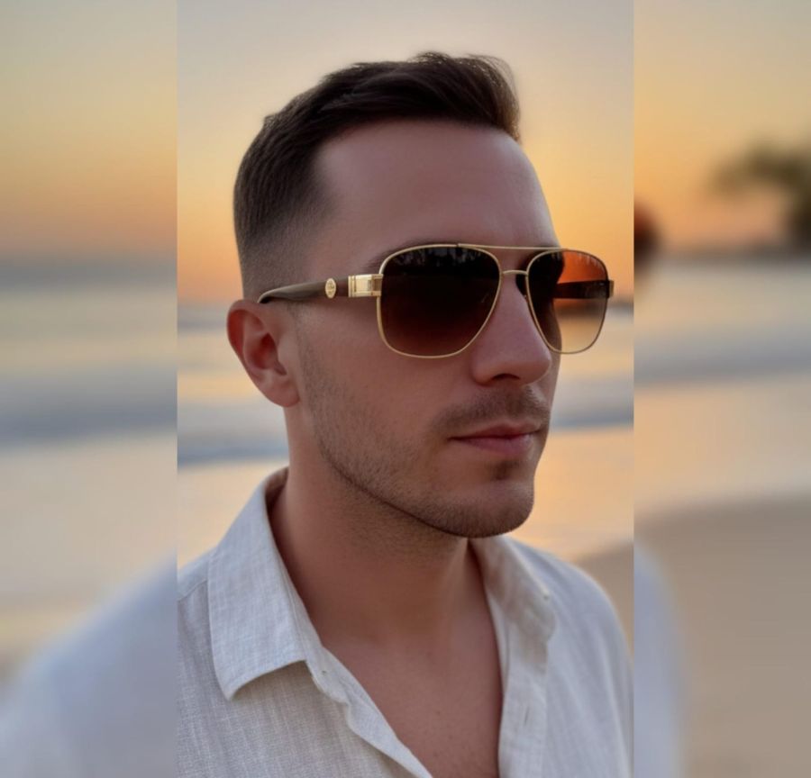Experience the pinnacle of coastal luxury. These premium aviator-style sunglasses feature a sophisticated gold-toned metallic frame intricately engraved with a signature geometric pattern.