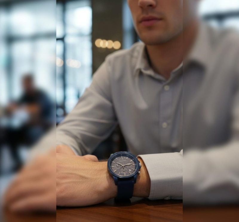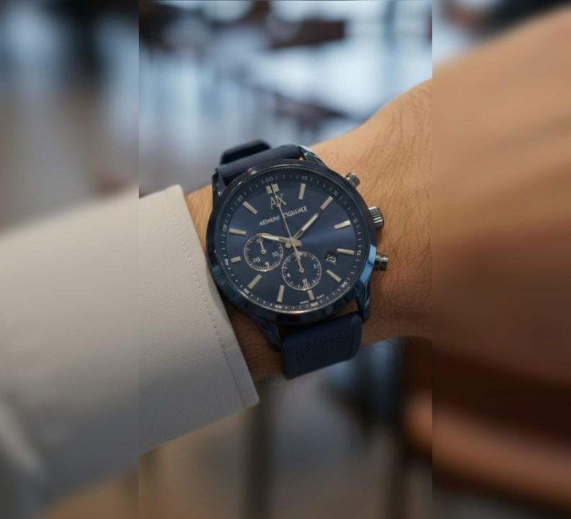 Make a powerful style statement with the Azure Stealth Chrono, a timepiece designed for the modern trendsetter. This watch features a deep Midnight Blue sunray dial housed in a matching Navy Blue brushed case for a seamless, tonal look. The face is detailed with three precision sub-dials, sleek silver-tone hour markers, and a practical date window at the 4 o'clock position.