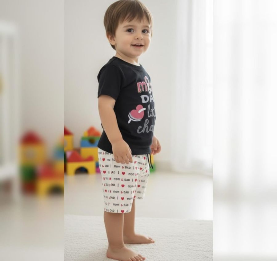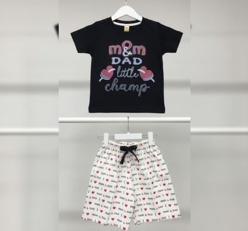 That is a charming little outfit! It looks like a comfortable two-piece set perfect for a toddler or young child. The "Mom & Dad's Little Champ" theme is a classic, sweet touch for a casual day out.