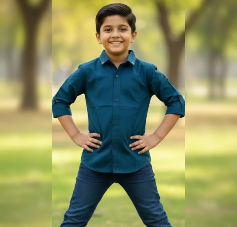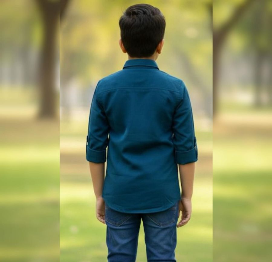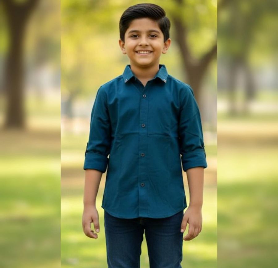 It’s a teal/dark petrol blue button-down, likely made from a cotton or cotton-blend poplin. It features a classic collar and roll-up sleeves with button tabs, which is a very practical detail for active kids.