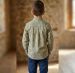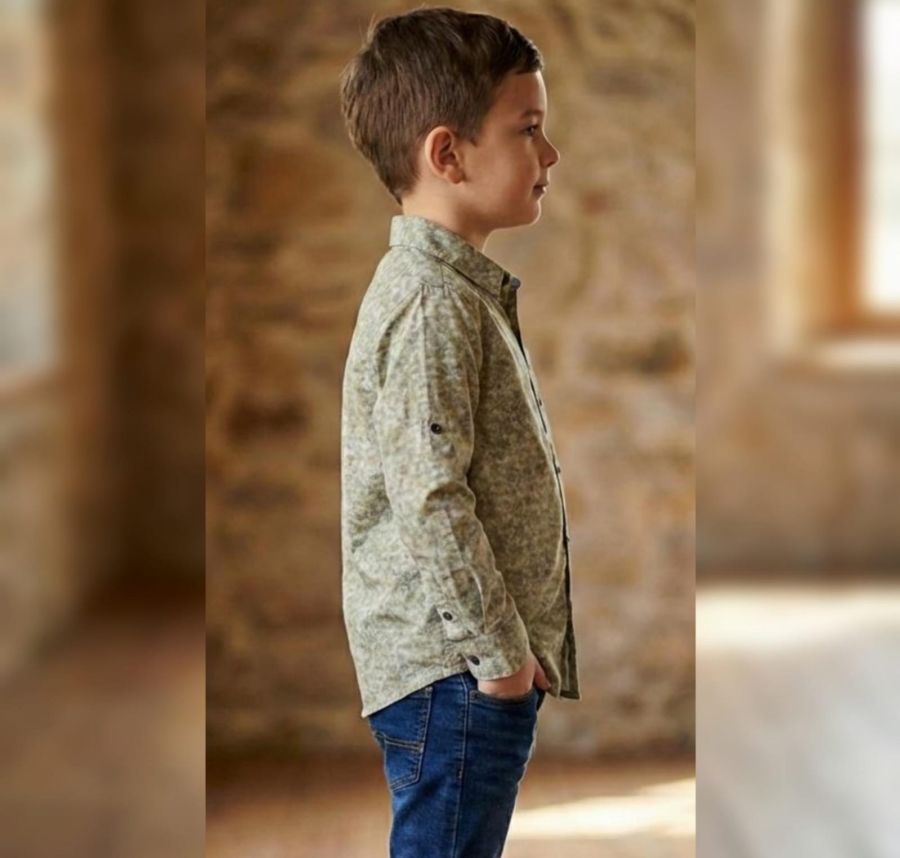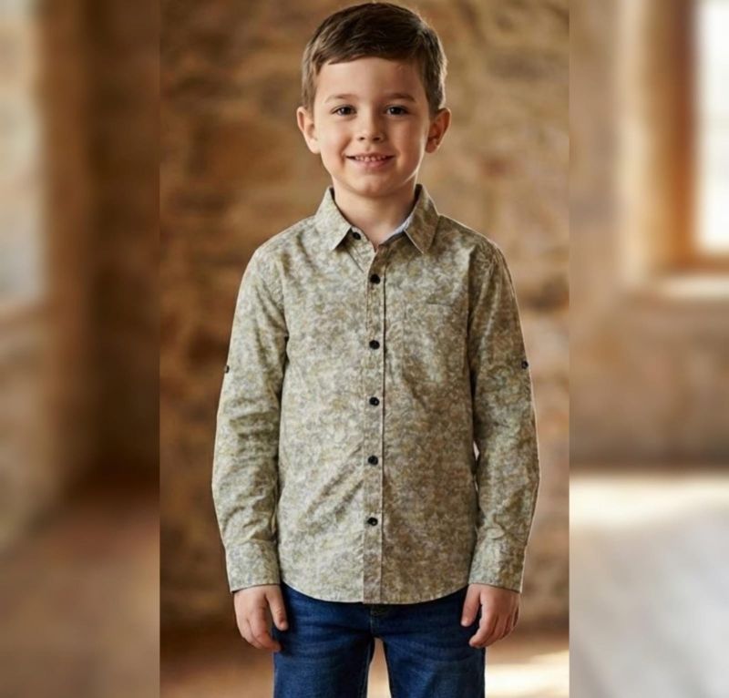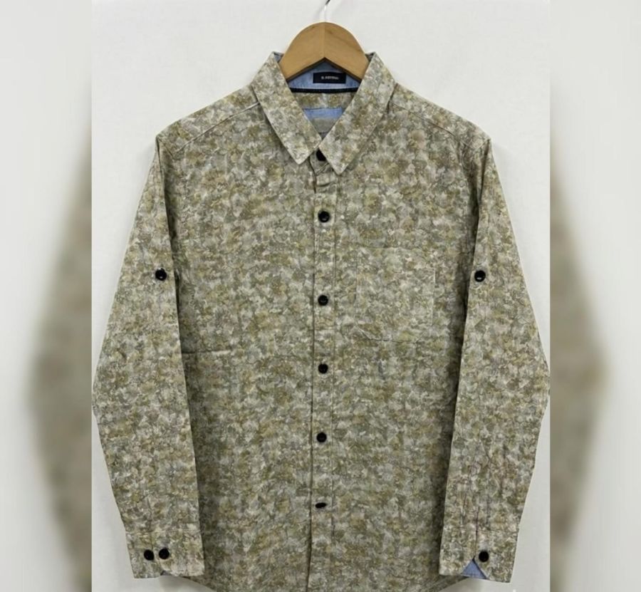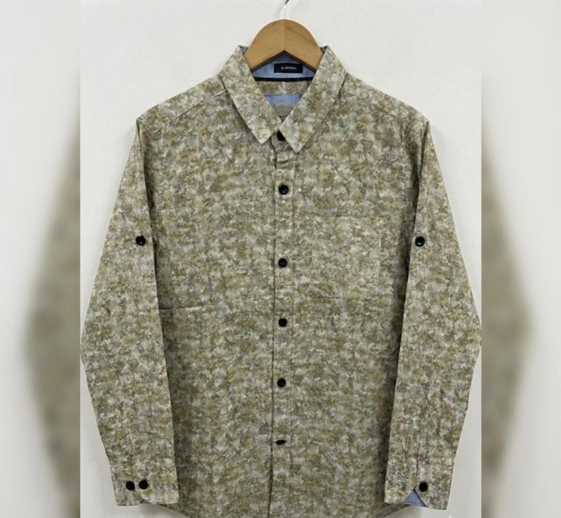a men's long-sleeve button-down shirt featuring a distinctive earth-toned camouflage or botanical print.
