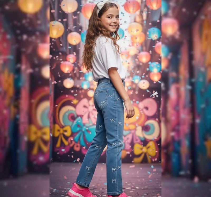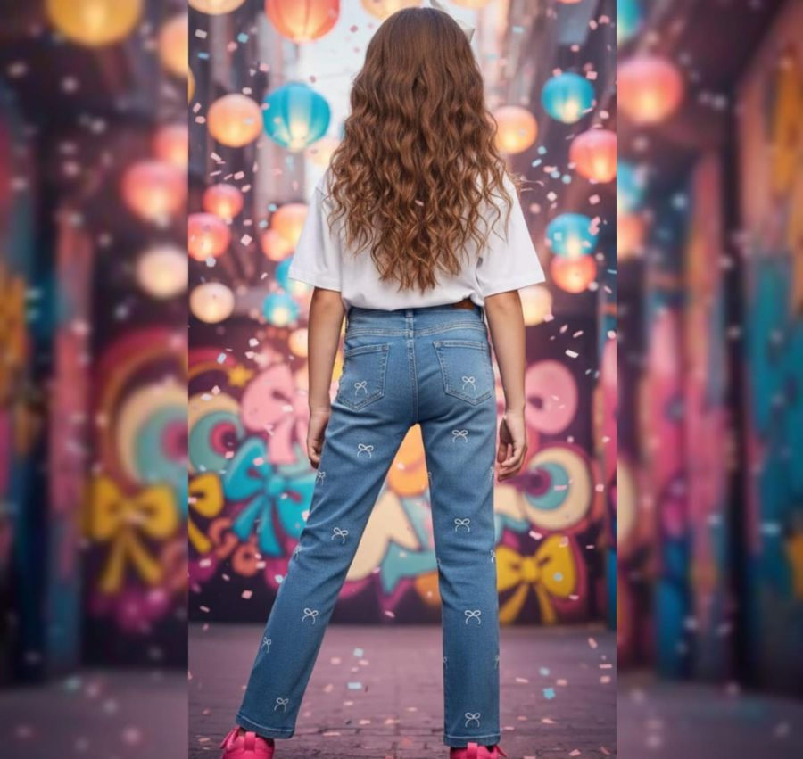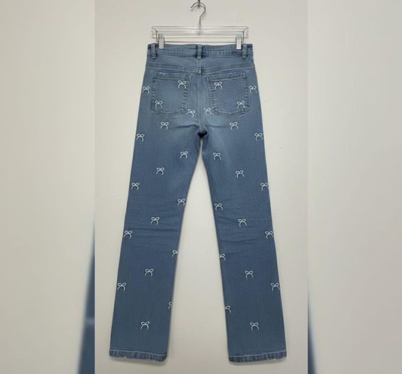 These light-wash blue jeans are designed with a high-waisted, straight-leg silhouette that offers both comfort and a modern aesthetic. The standout feature is the all-over white bow print, which is delicately scattered across the front and back of the garment. Crafted from durable, high-quality denim, these pants are a versatile choice that can be easily paired with basic tees or stylish blouses.