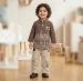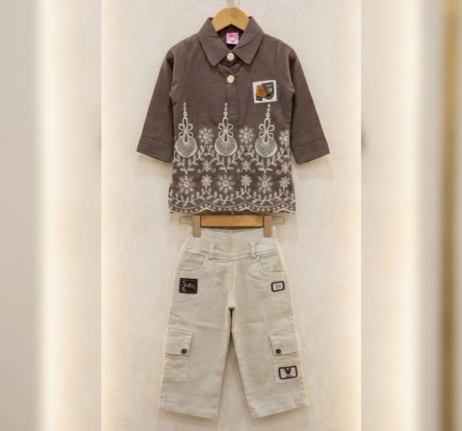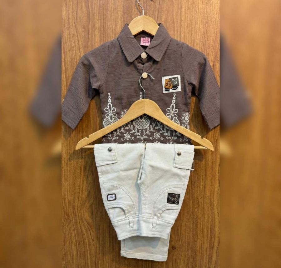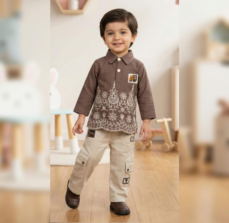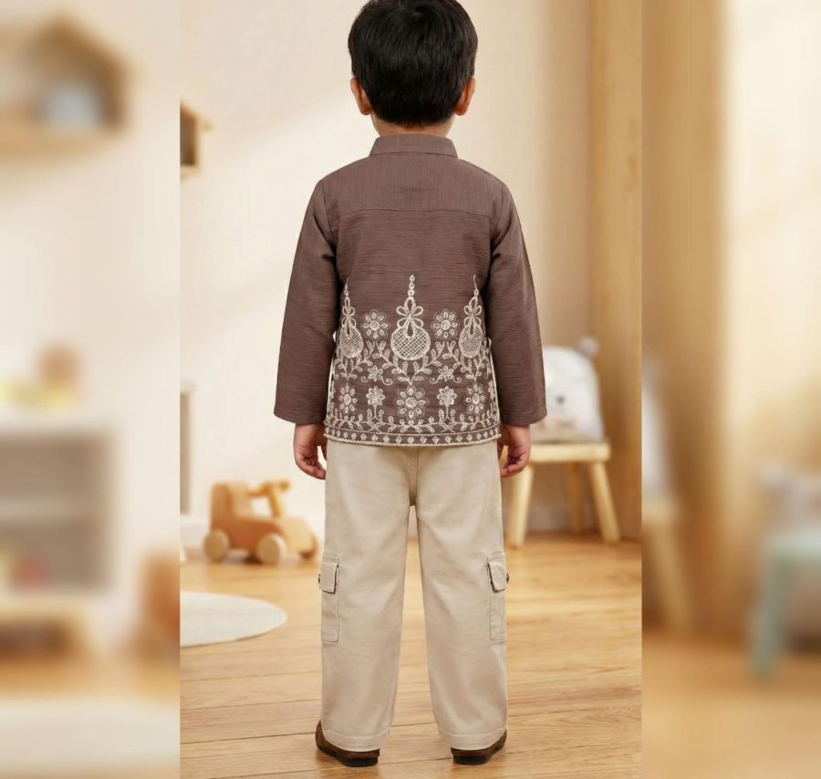 Elevate your little one's wardrobe with this sophisticated two-piece set. The ensemble features a rich brown long-sleeved shirt adorned with intricate white floral embroidery at the hem and a classic polo-style collar.