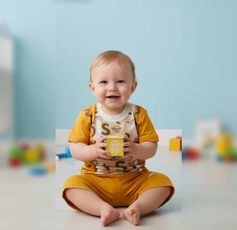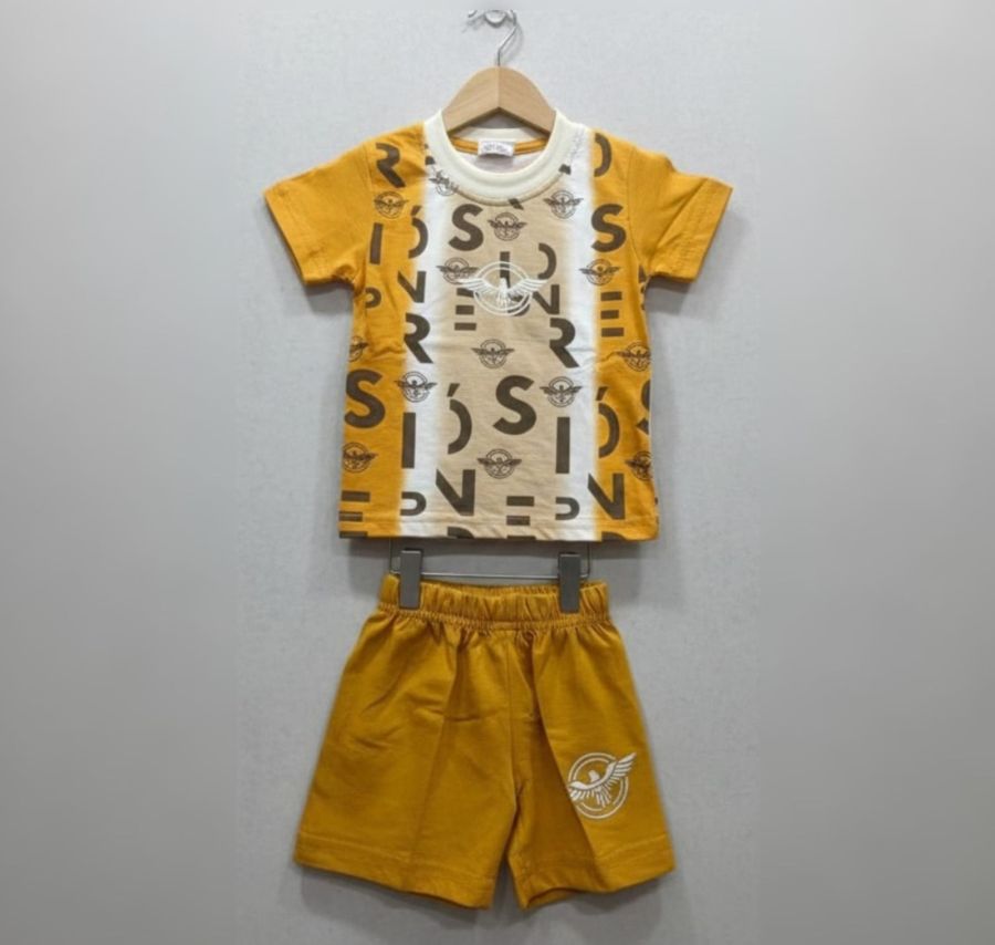 Brighten up your little one's day with this energetic two-piece coordinated set. Designed for toddlers on the move, this outfit combines a soft, breathable jersey fabric with a bold, contemporary print. The warm mustard yellow tone is perfectly balanced with cream and black accents, making it a standout choice for playdates or casual outings.
