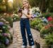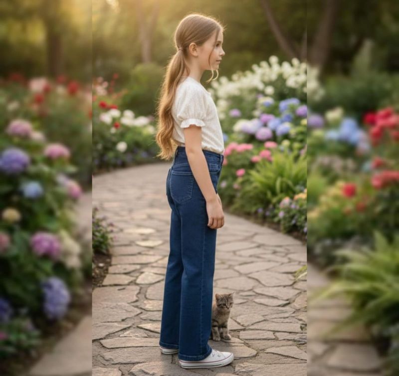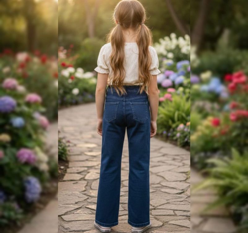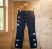 Features delicate white butterfly applique/embroidery detailing along the outer sides of both legs. Style: High-waisted with a classic 5-pocket design, zip fly, and button closure. The fit is a clean straight-leg cut that pairs perfectly with cropped tees or tucked-in blouses.