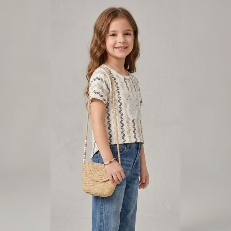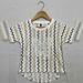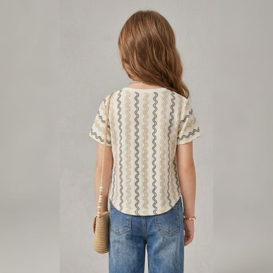 Type: Children's short-sleeved t-shirt. Color Palette: White base color with alternating black and beige/gold vertical wavy stripes.