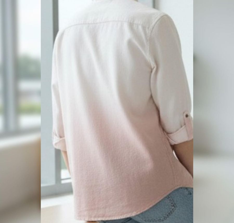 Colorway: It features a "Dip-Dye" or Ombre effect, transitioning from a crisp white at the shoulders and collar to a soft pastel pink/peach at the hem.