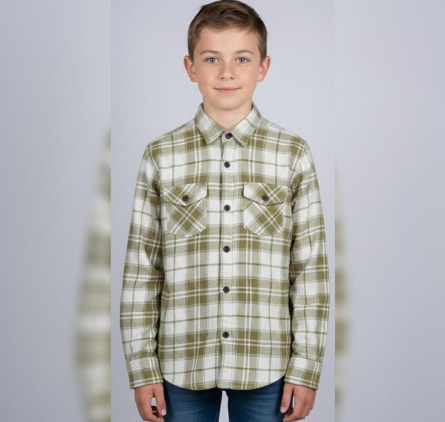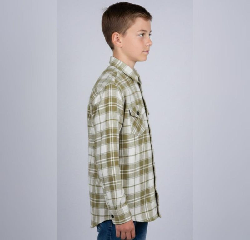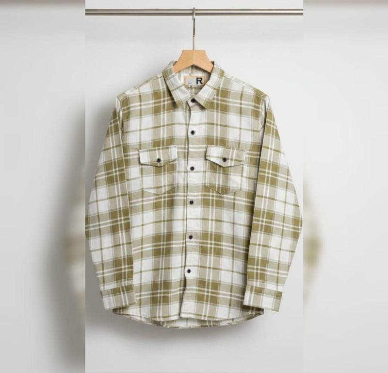 a classic olive and cream flannel shirt, perfect for a rugged yet clean casual look. Based on the "R" branding and the overall construction, this is likely a heavy-duty cotton or blended flannel.