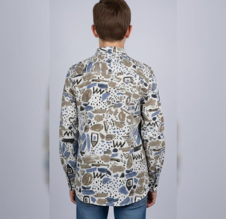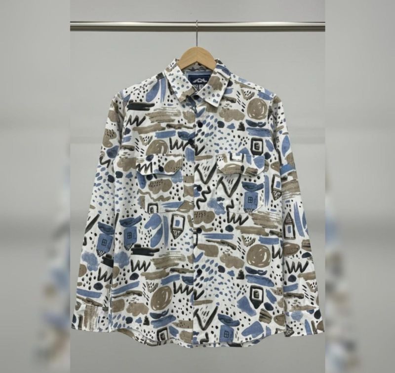 The shirt in the image features a contemporary abstract brushstroke print with a mix of earthy tones (olive, tan) and cool blues. It has a utilitarian feel with those dual chest pockets, making it a great "shacket" or statement button-down.