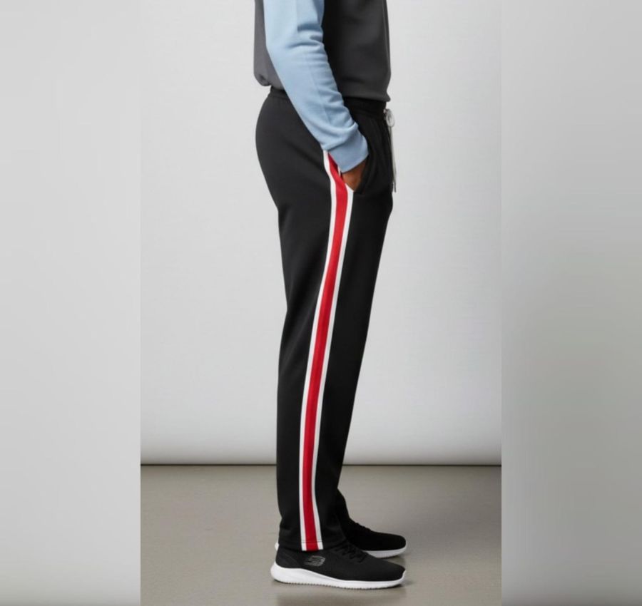 These are classic-fit track pants in a deep black base, accented with vibrant side paneling. They are designed for a look that transitions easily from a workout to a casual street style.