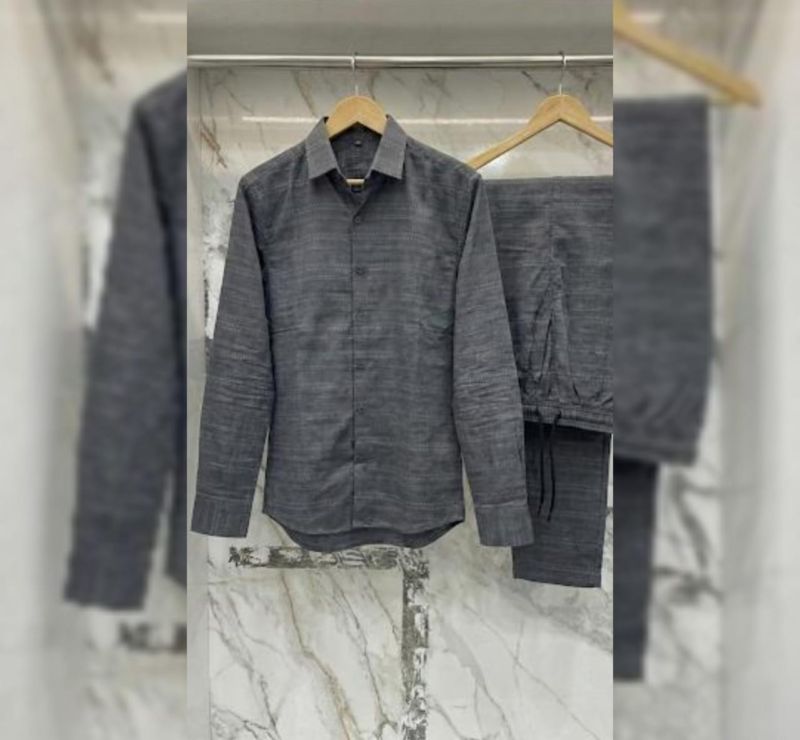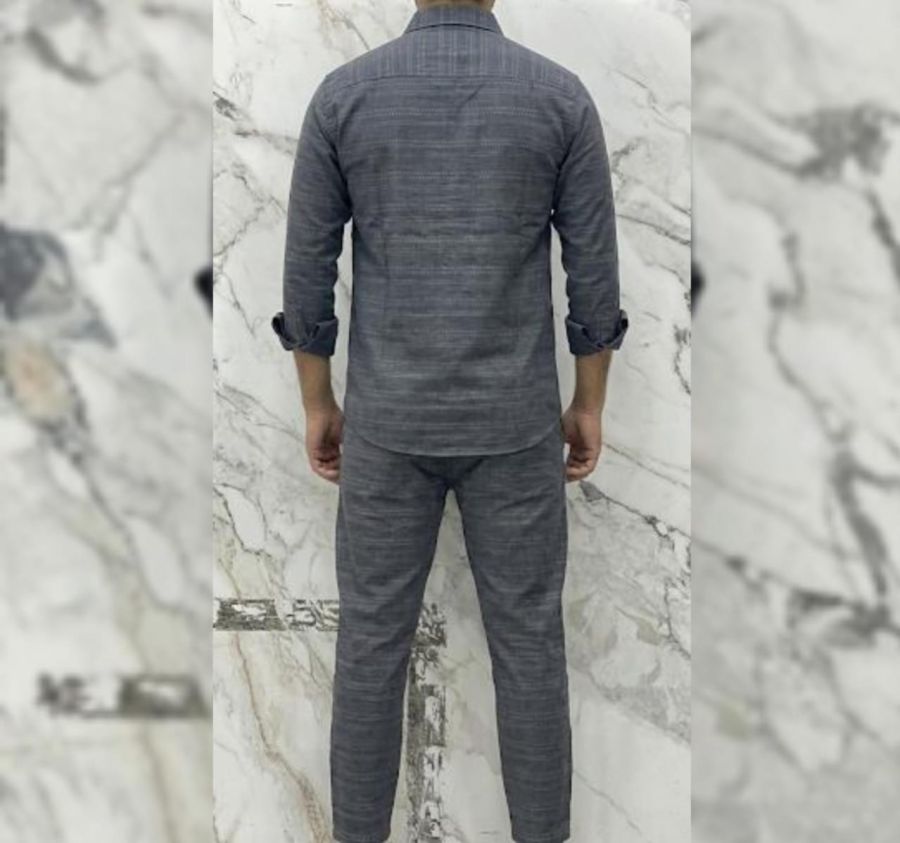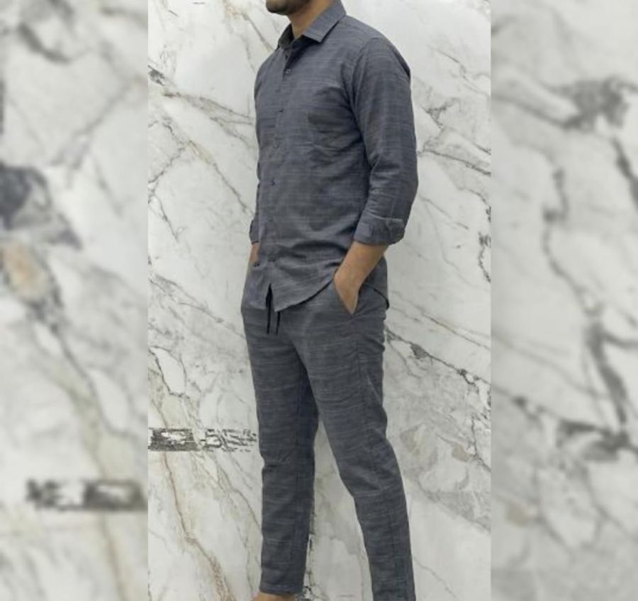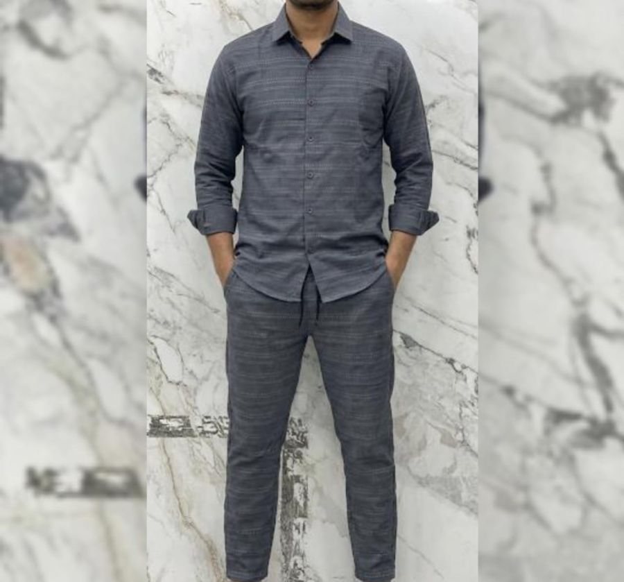 Make a bold statement in minimalism with the Obsidian Wave. This premium two-piece set features a deep charcoal hue enriched with a sophisticated horizontal "wave" texture. It is designed for the man who appreciates sharp tailoring combined with the comfort of luxury loungewear.