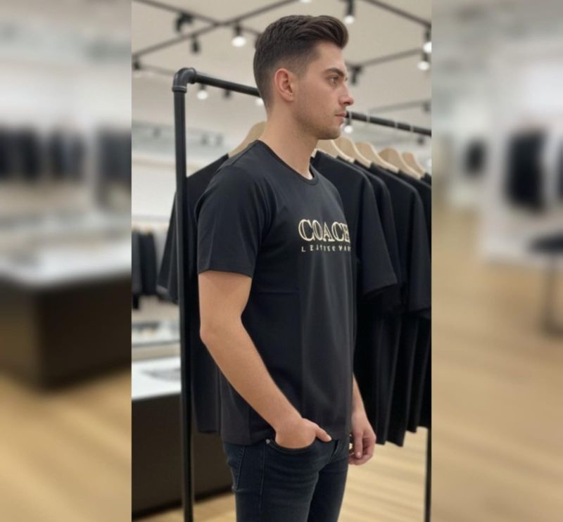 This COACH Signature Graphic T-Shirt in bold black offers a sharp, modern look. The gold-toned "COACH LEATHERWARE" logo creates a high-contrast, premium finish that makes this a standout essential for any casual or semi-formal outfit.
