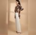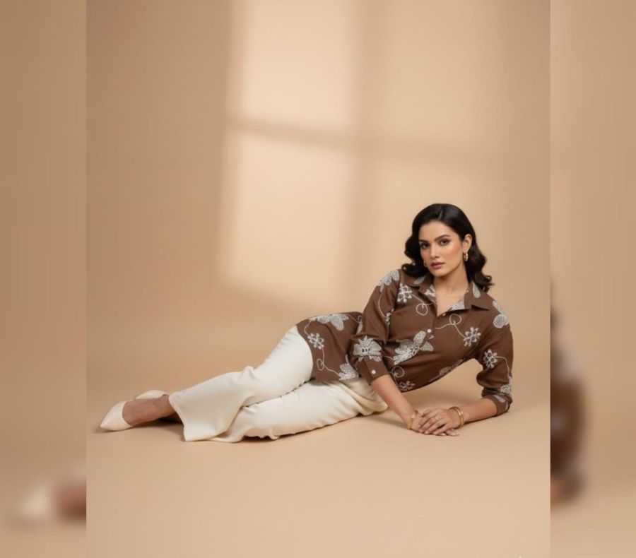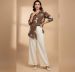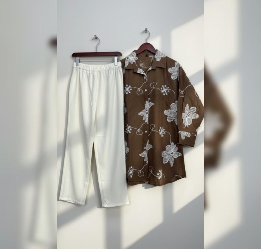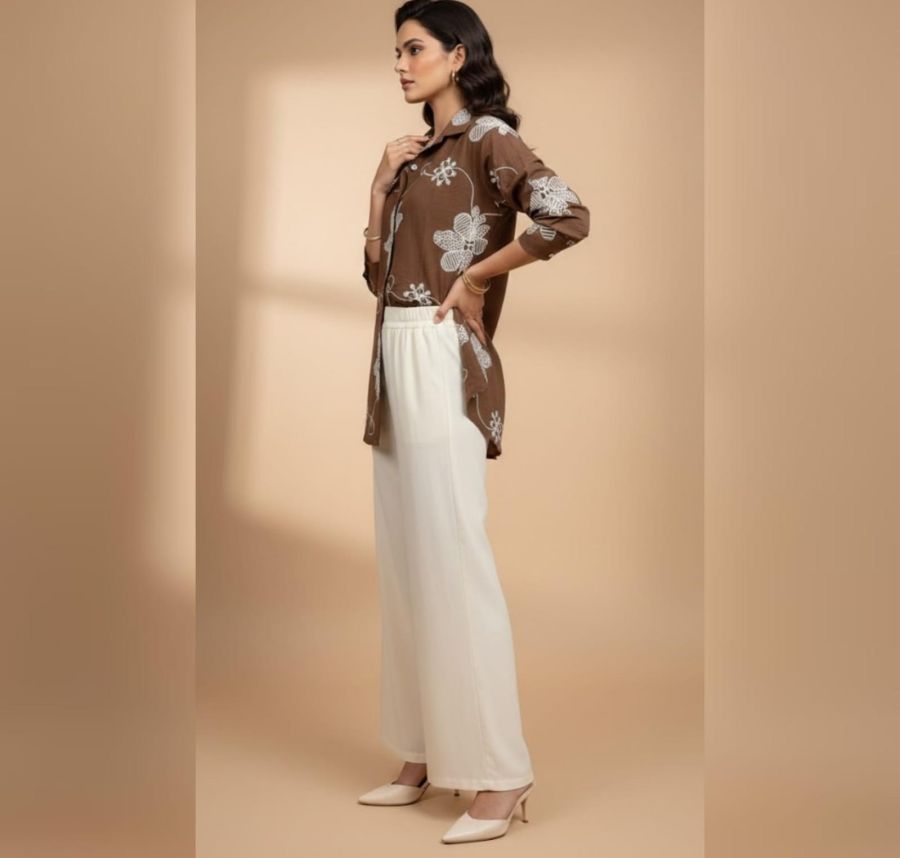 This striking 2-piece ensemble is a perfect blend of modern comfort and traditional craftsmanship. Featuring a rich chocolate brown shirt-style tunic with bold, white floral embroidery, it is paired with flowing off-white wide-leg trousers for a balanced and chic look.