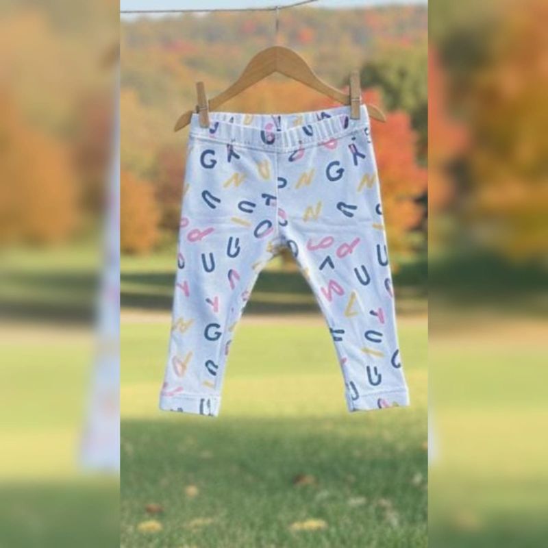 These are a pair of toddler or children's leggings. They feature an all-over print of stylized capital letters in various pastel and bold colors (including pink, yellow, and blue)