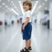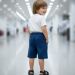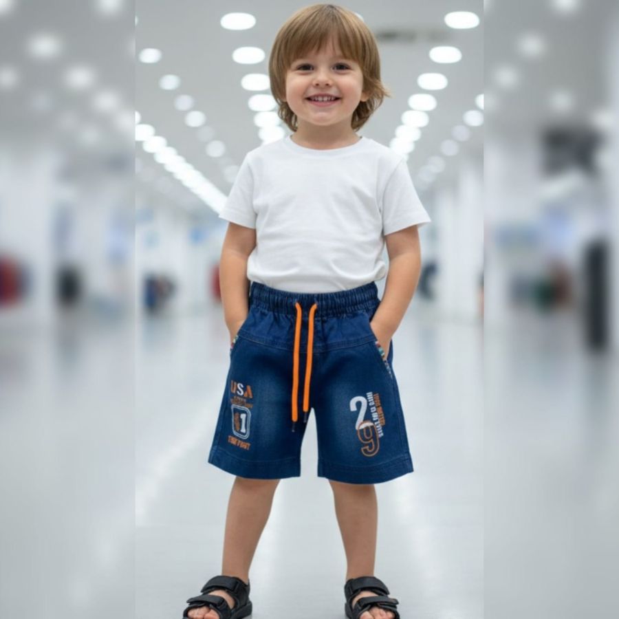 That’s a pair of classic denim shorts with a sporty, energetic vibe! The dark wash paired with those bold orange accents really makes them pop.