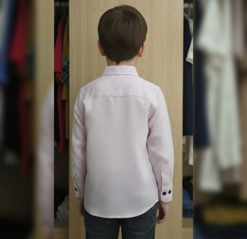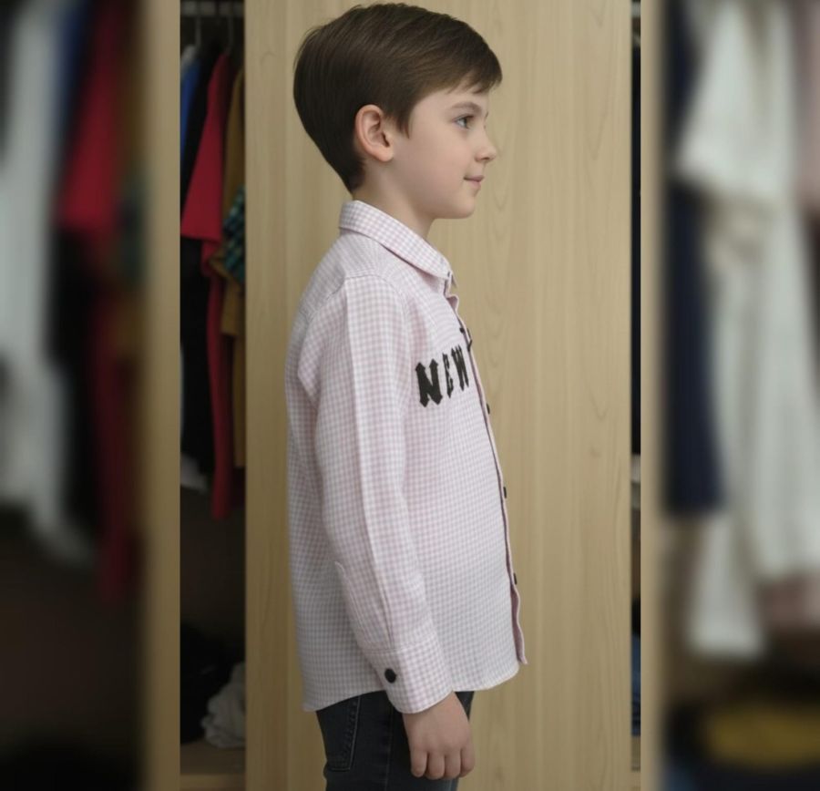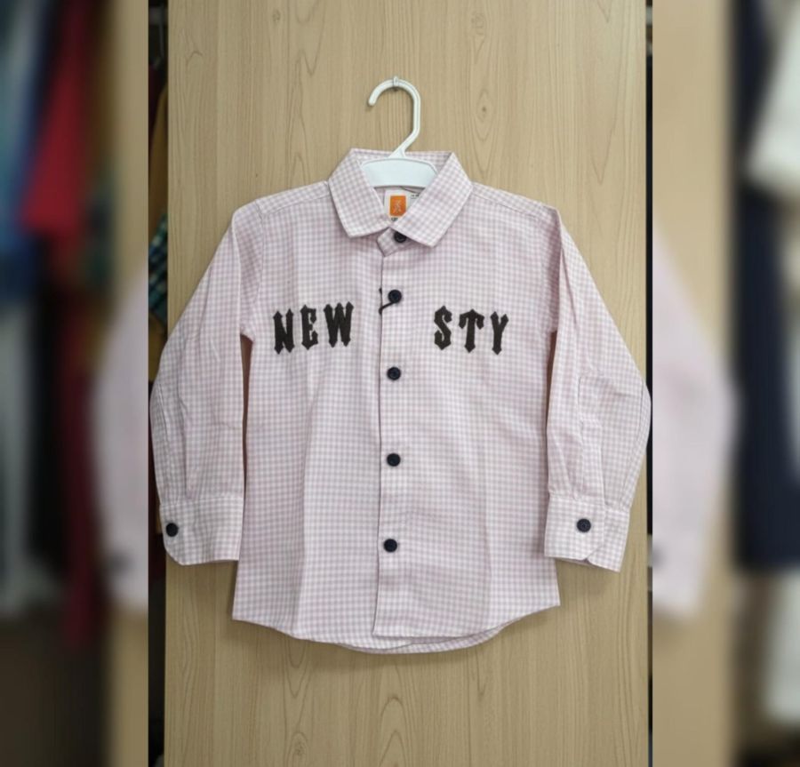 That's a classic, versatile piece for a young wardrobe! It looks like a pink and white gingham (checkered) button-up shirt with some bold "NEW STY" lettering across the chest.