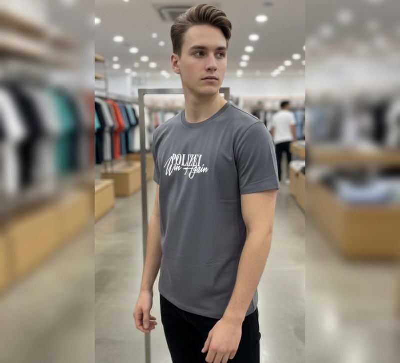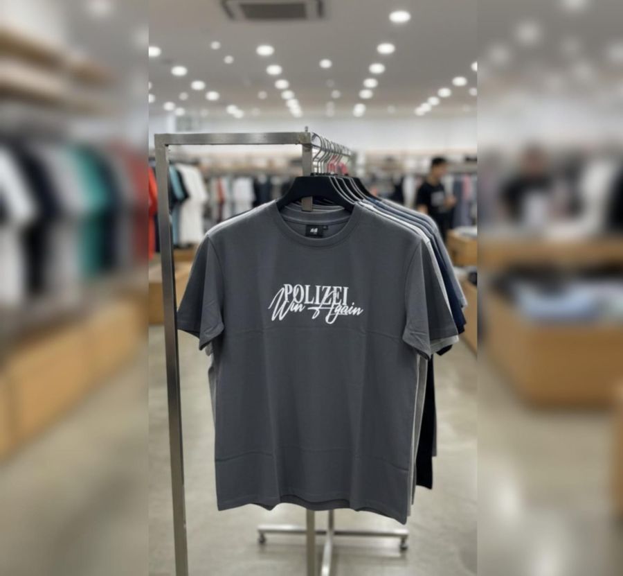That is a sharp-looking t-shirt! It looks like you've found a graphic tee from H&M, specifically one featuring a "Polizei" (German for Police) motif with a stylized "Win Again" script overlay.