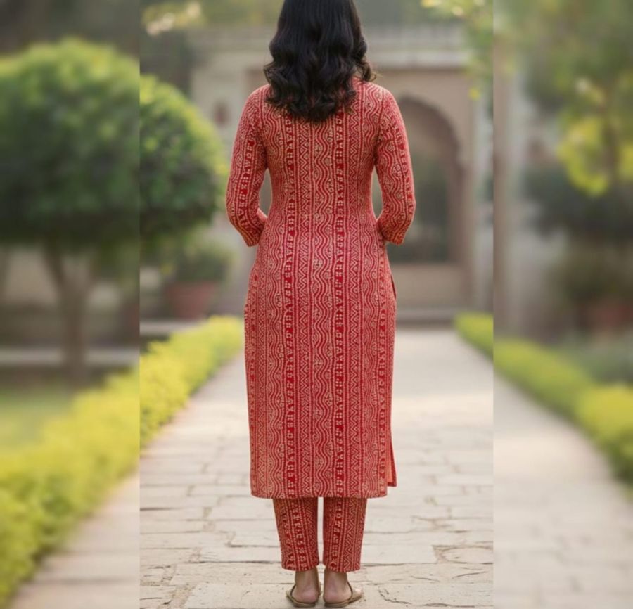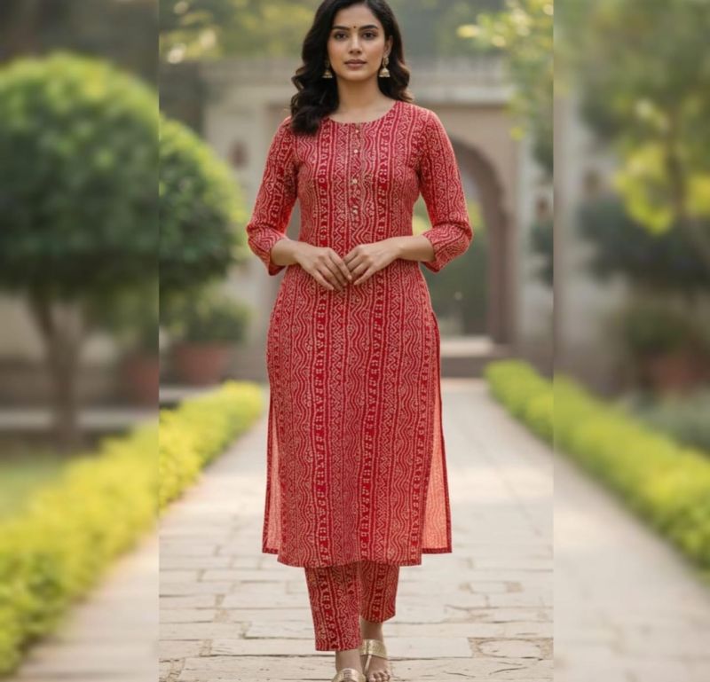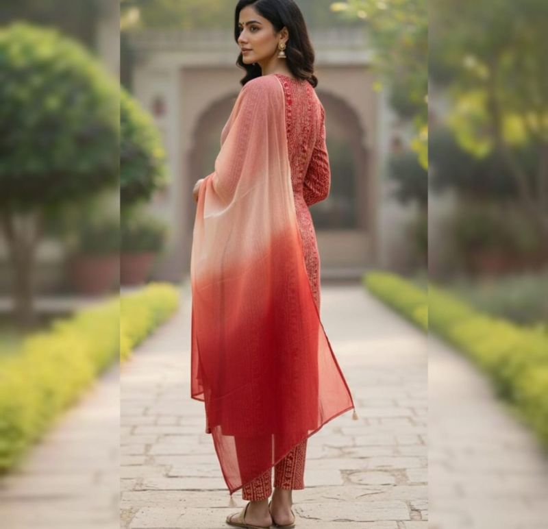Radiate traditional elegance with this vibrant Ruby Red 3-piece ethnic suit. This set features a straight-cut kurta showcasing classic Bandhani-inspired patterns in a vertical arrangement that creates a tall, slimming silhouette. The ensemble is elevated by a stunning dual-tone ombre dupatta, fading from soft peach to deep red, and is paired with matching printed straight-fit trousers. Perfect for festive celebrations, family gatherings, or casual day outings, this suit offers a timeless look with a contemporary touch.
