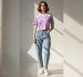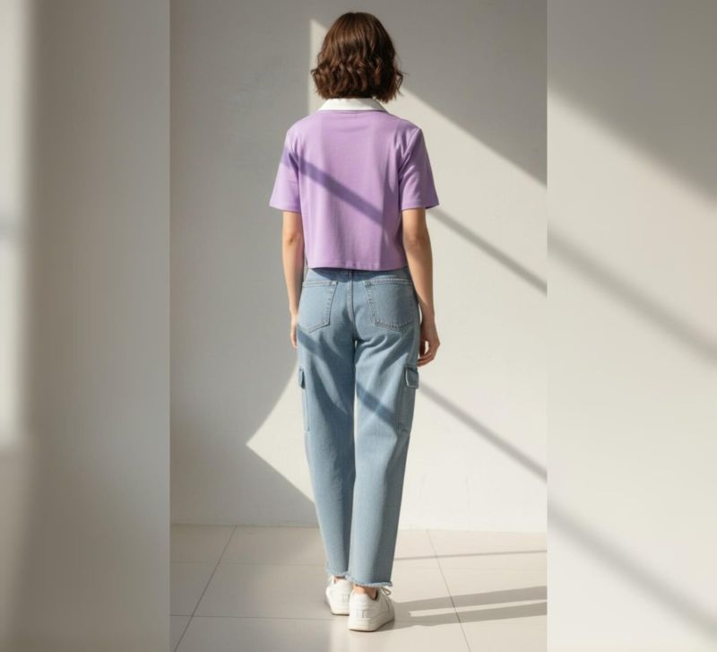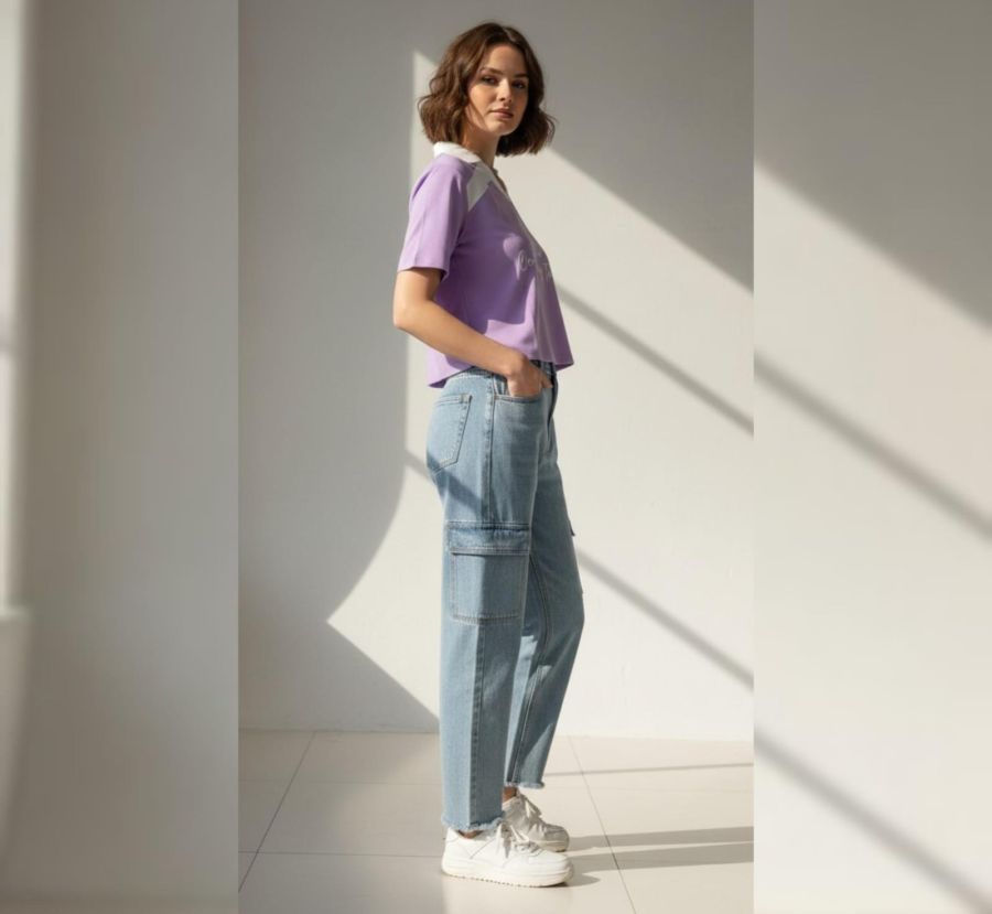 A modern casual streetwear, blending a "preppy" athletic aesthetic with the utility of cargo-style denim. It’s a relaxed, youthful look that works well for daily wear or social hangouts.