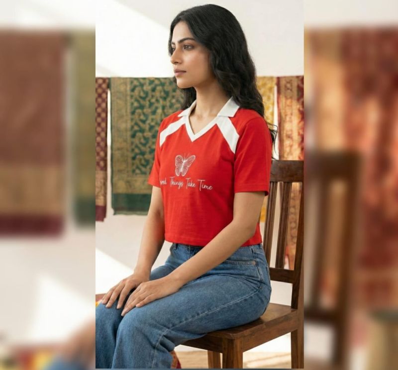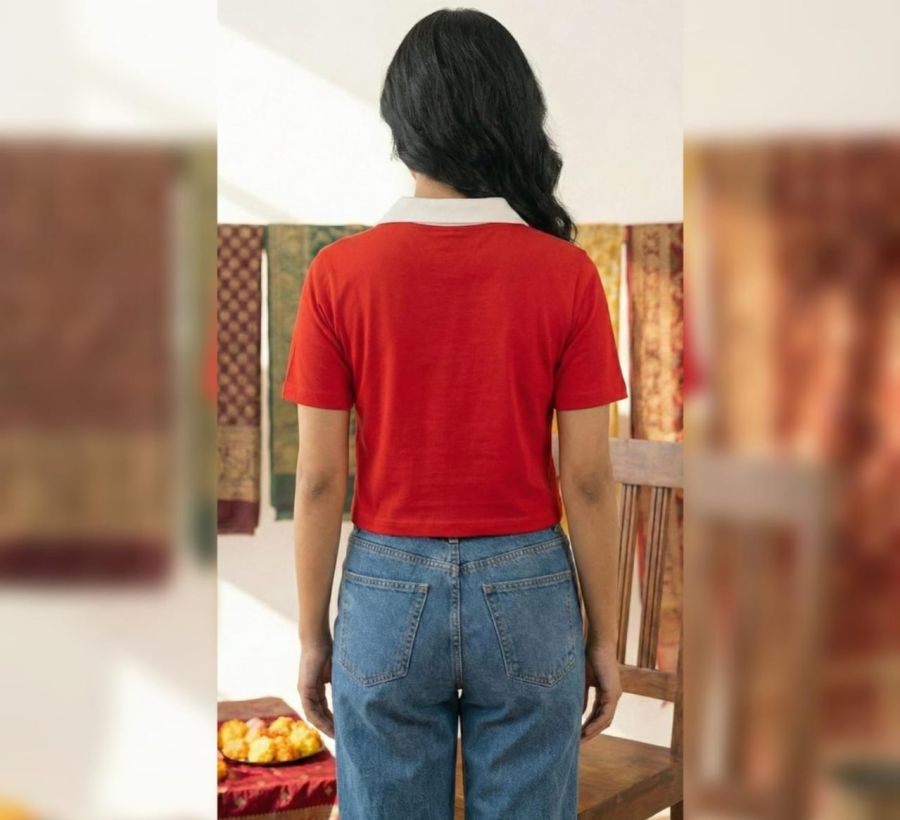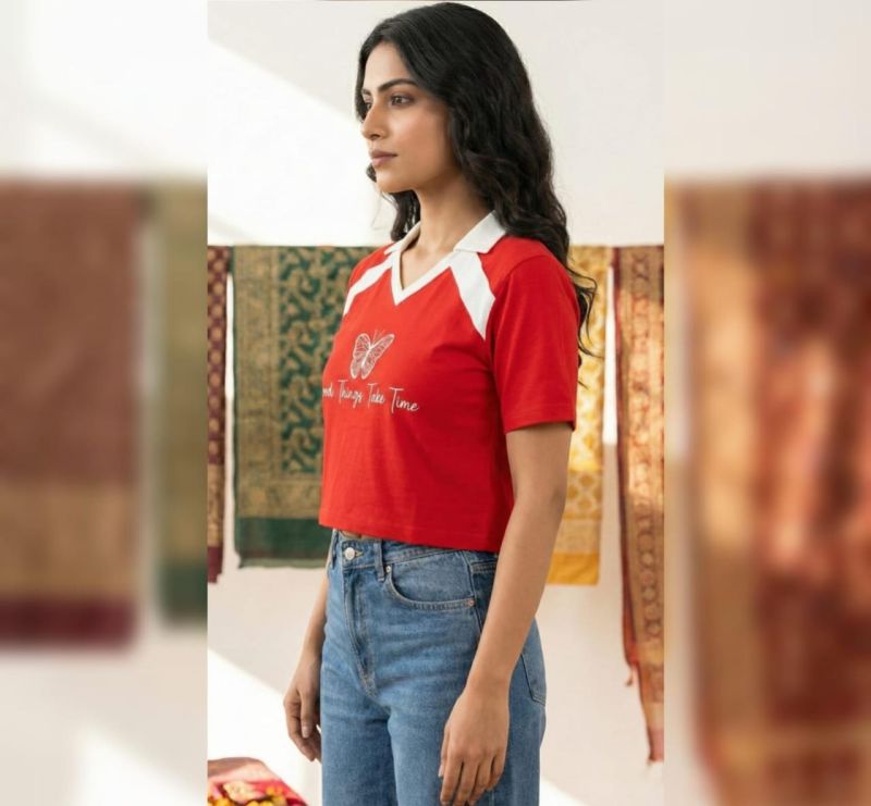 This top is a fusion of vintage sportswear and contemporary streetwear. The bold red color is grounded by the white accents, while the "Good Things Take Time" graphic adds a touch of "slow fashion" philosophy. It is typically crafted from a Cotton-Spandex blend or a Jersey fabric, providing enough stretch for comfort while maintaining a structured polo look. It pairs exceptionally well with high-waisted denim, as seen in the image, or athletic skirts.