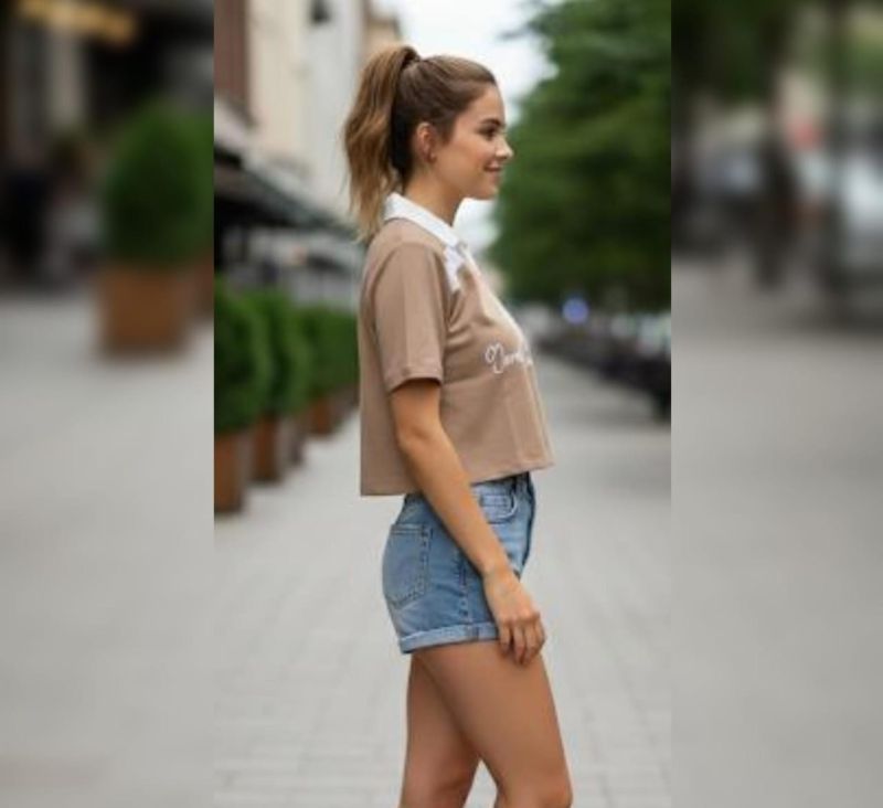 a casual, sporty-chic outfit. The aesthetic is bright and modern, focusing on a coordinated streetwear look.
