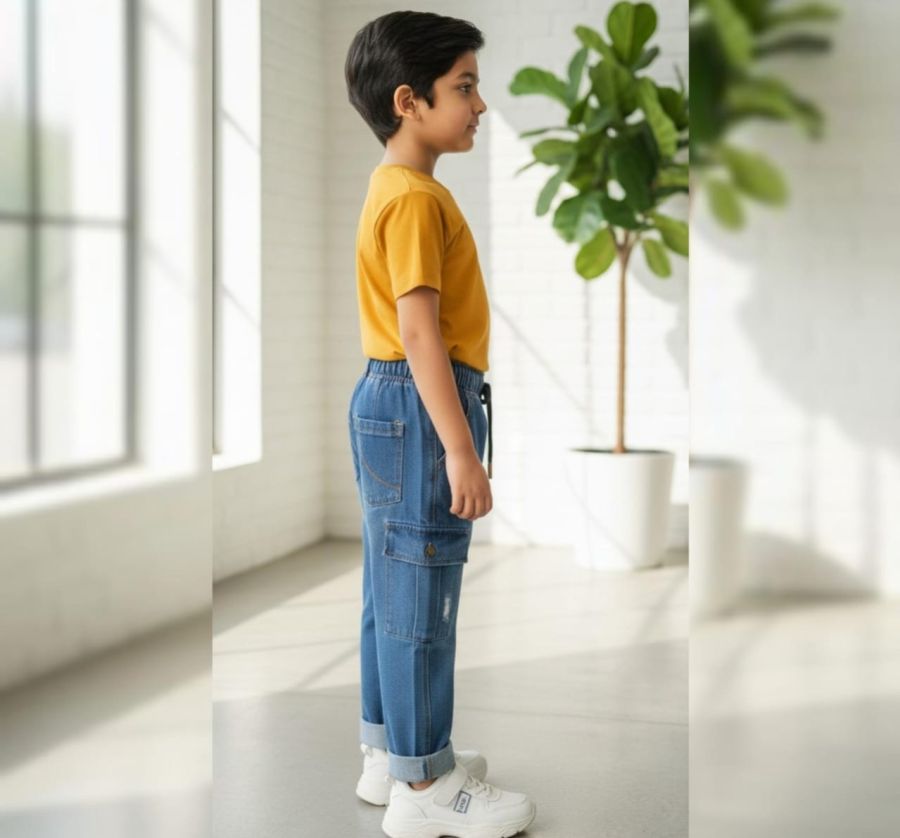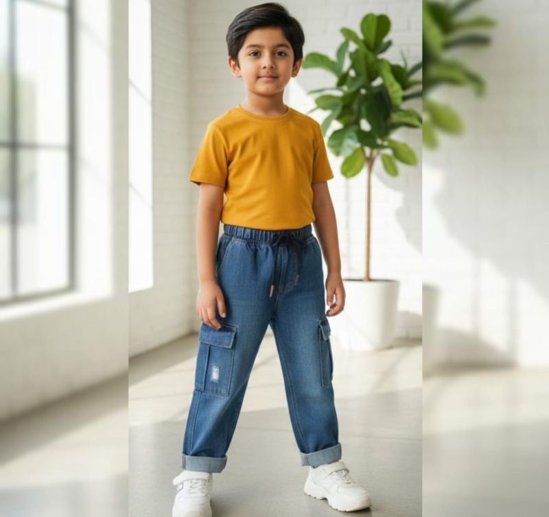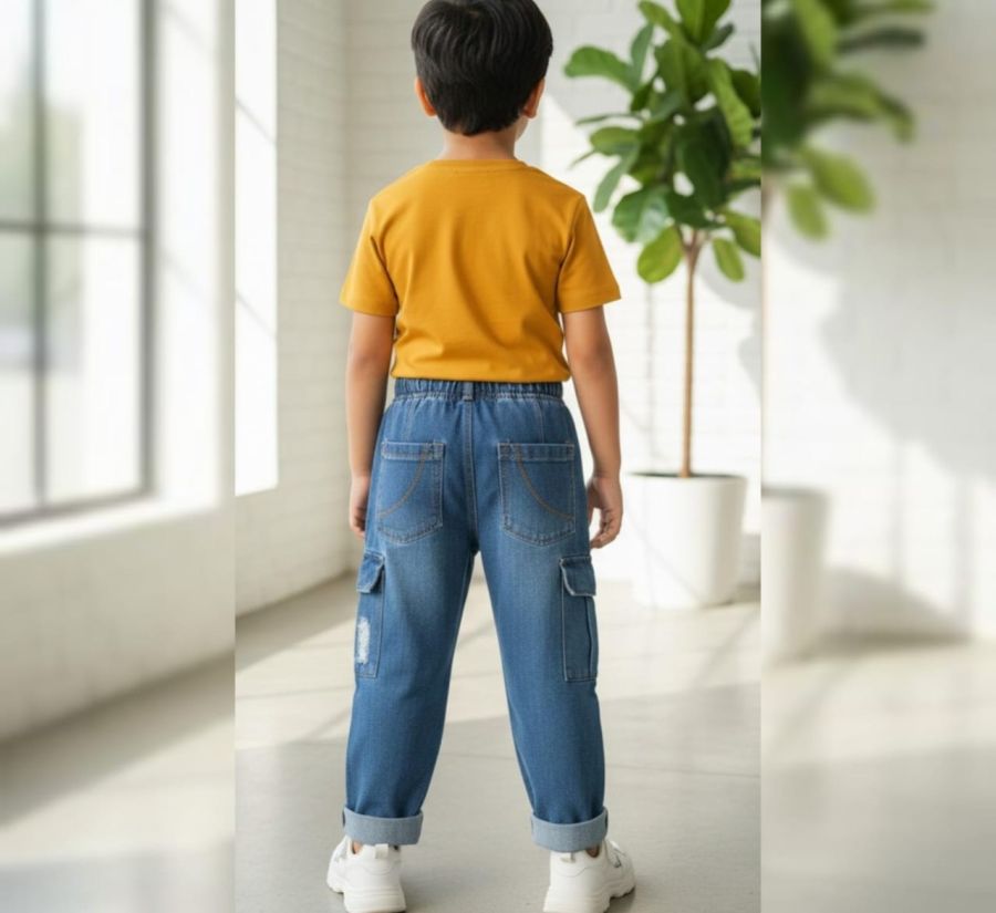 Durable blue denim cargo pants with distressed accents and deep side pockets, finished with an elastic waistband for all-day comfort.