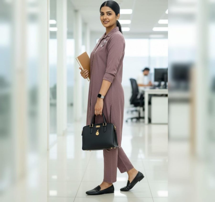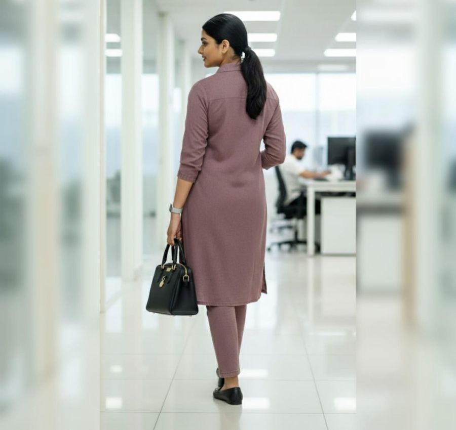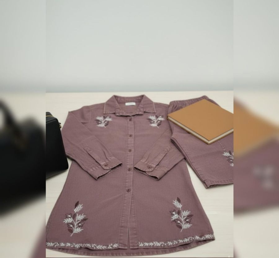 This chic 2-piece set is perfect for office wear or semi-formal gatherings. It combines the structure of a shirt with the comfort of a relaxed co-ord, featuring delicate floral embroidery that adds a hint of elegance to the muted tone.