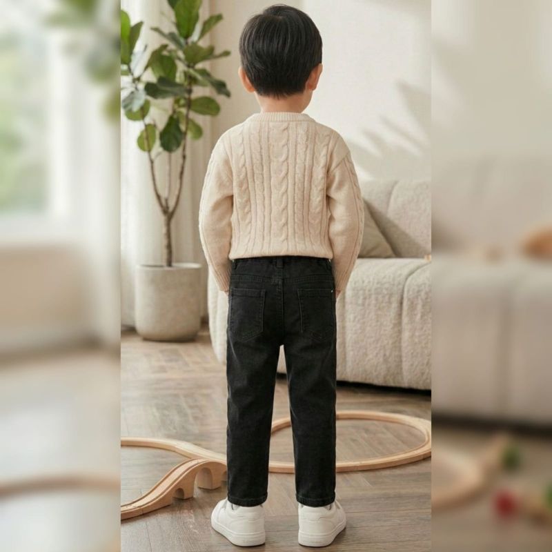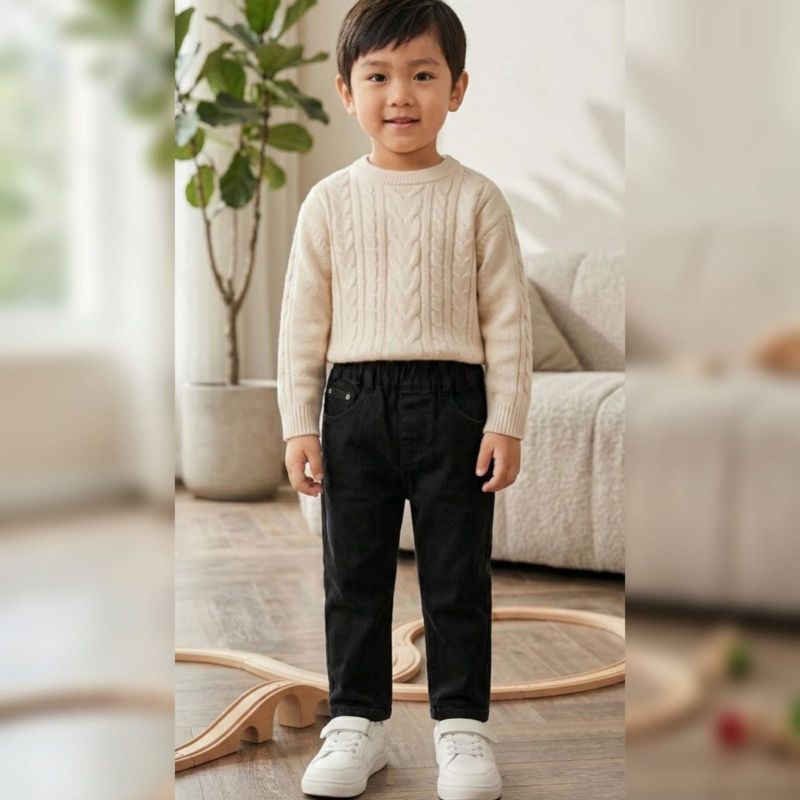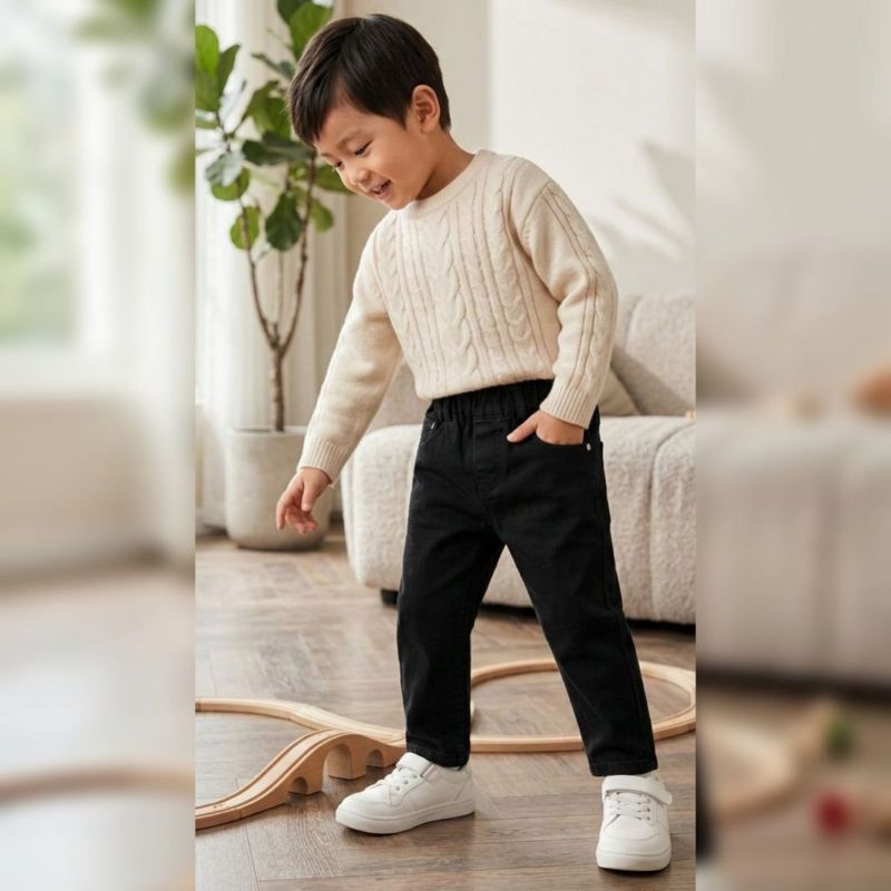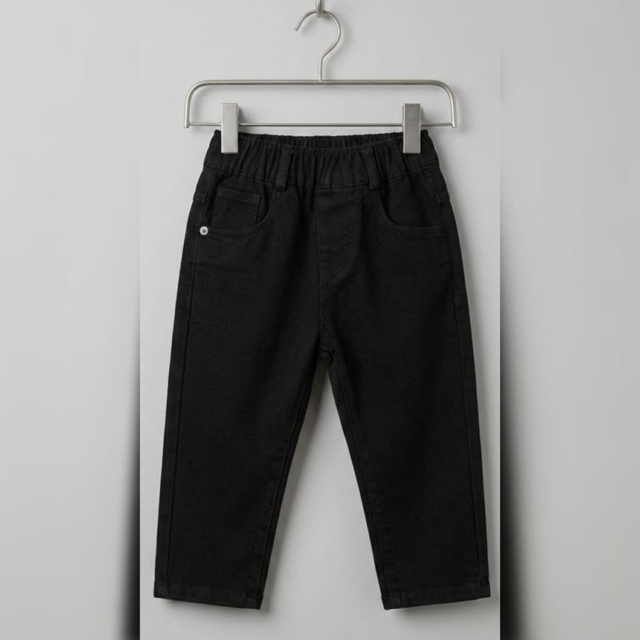 Those are a solid, versatile pair of black toddler/kids' denim trousers. They feature a comfortable elasticated waistband, which is a lifesaver for quick changes and growth spurts, while keeping the classic "mini-adult" look with the pocket detailing and belt loops.
