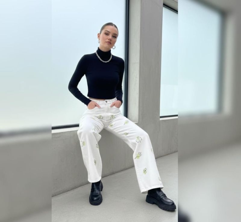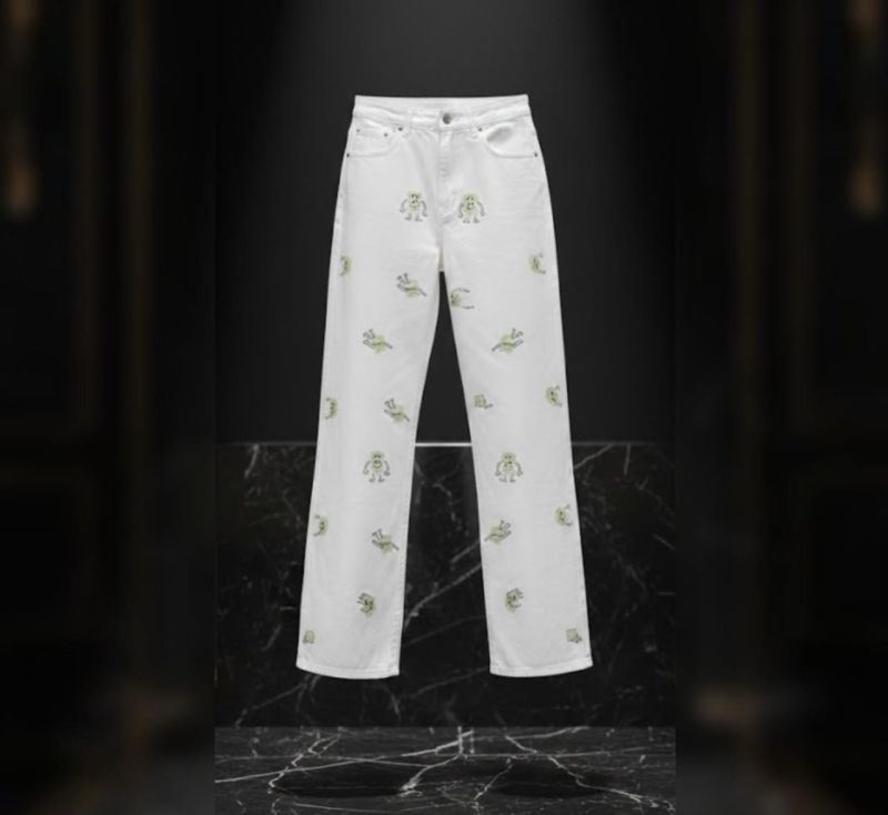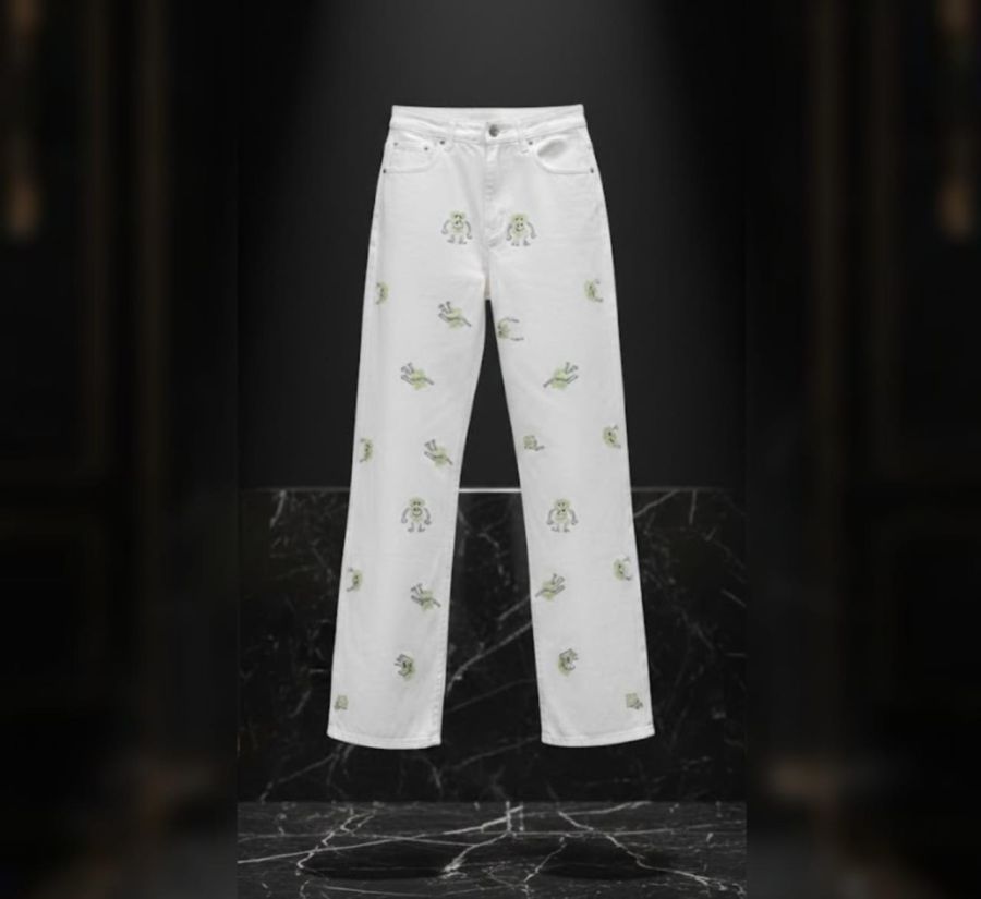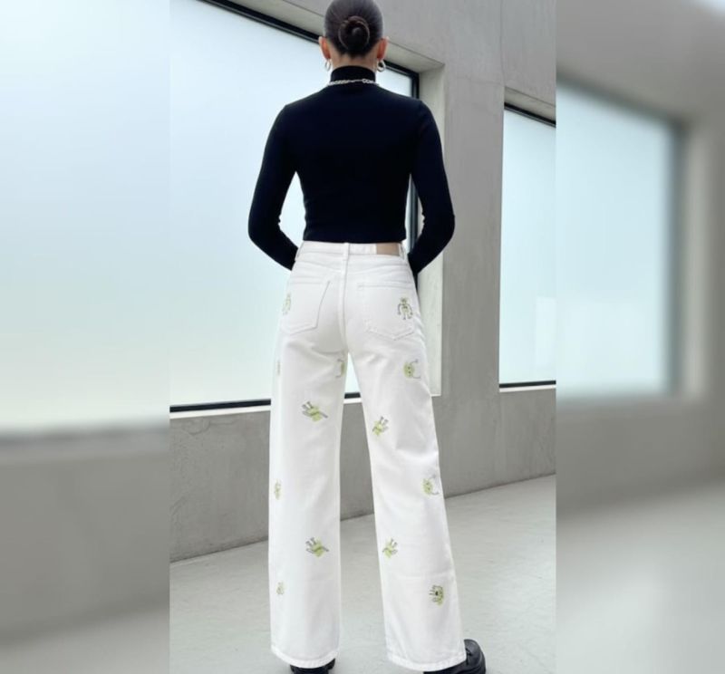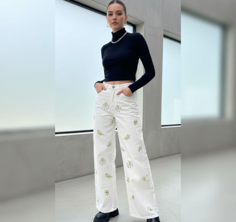 Express your creative side with the Doodle-Art Denim. These crisp white jeans serve as a canvas for unique, lime-green embroidered characters scattered across the front, giving them a fun, "hand-drawn" aesthetic. Designed with a modern wide-leg cut and a comfortable high-rise waist, these jeans are the ultimate statement piece for a fresh, urban look.