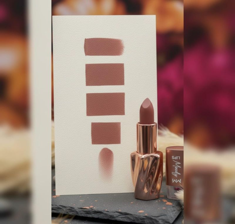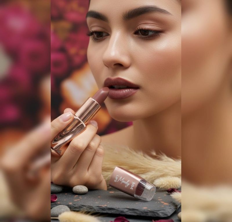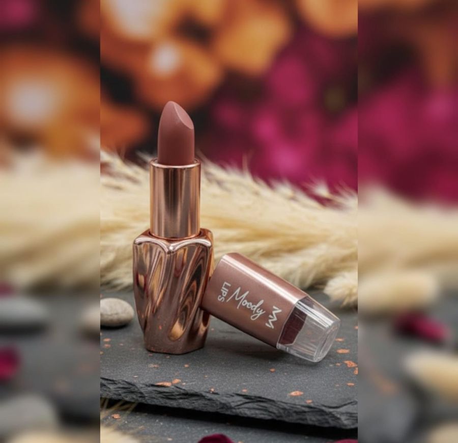 a high-end, aesthetically pleasing lipstick from the brand Moody Lips. The presentation leans into a "boho-chic" or rustic luxury aesthetic, emphasizing warm tones and textures.