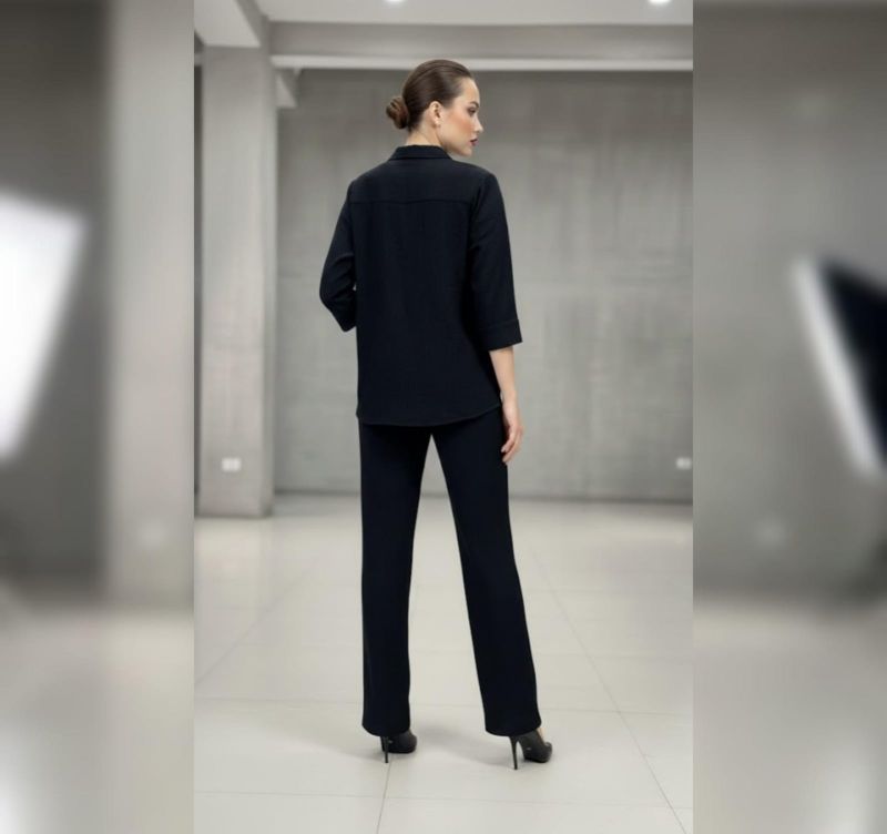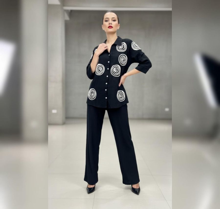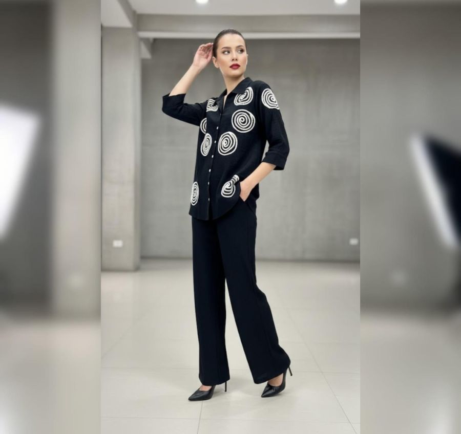 This sophisticated 2-piece set offers a high-contrast, modern aesthetic. The deep black fabric provides a dramatic backdrop for the bold white spiral motifs, creating a look that is both avant-garde and effortlessly professional.