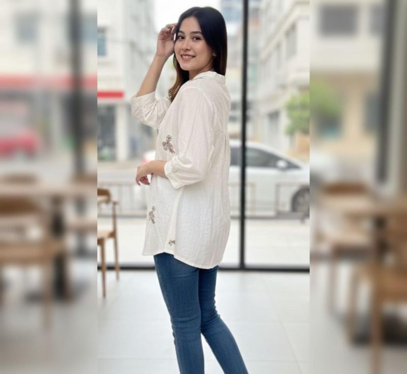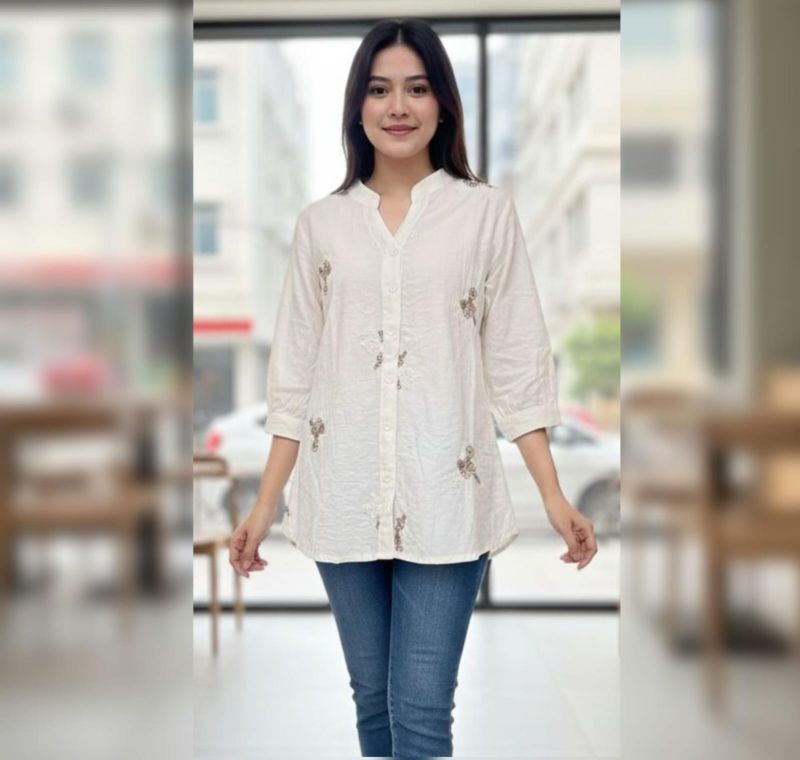 Elevate your everyday style with this beautifully crafted off-white short kurti. Designed for the modern woman who appreciates ethnic details, this top features delicate floral embroidery that adds a touch of grace to the minimalist design.