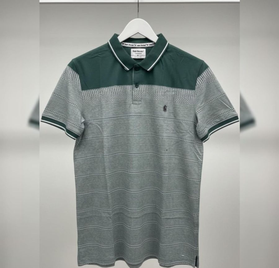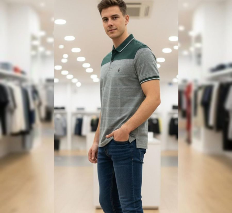 Make a bold statement with the Emerald Horizon Textured Polo. This high-performance piece features a striking deep emerald green chest panel that transitions into a heather grey body detailed with intricate horizontal micro-patterns. Finished with a tipped collar and cuffs, this polo combines a technical athletic feel with classic smart-casual tailoring.