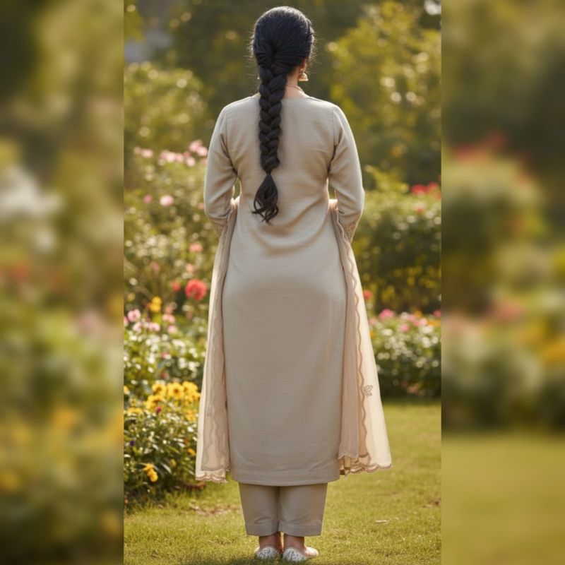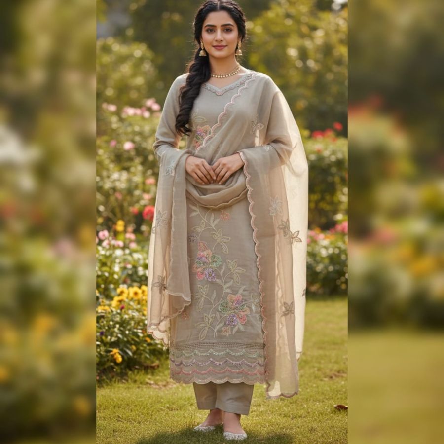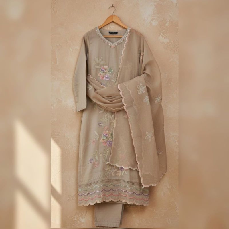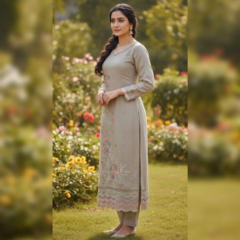 This ensemble is a sophisticated, straight-cut salwar kameez suit in a soft, neutral Mushroom Grey (Taupe) shade. It exudes an air of understated elegance, perfect for daytime events, garden parties, or festive gatherings.