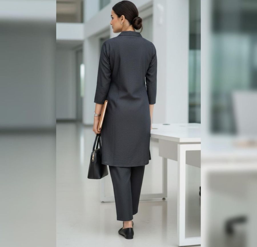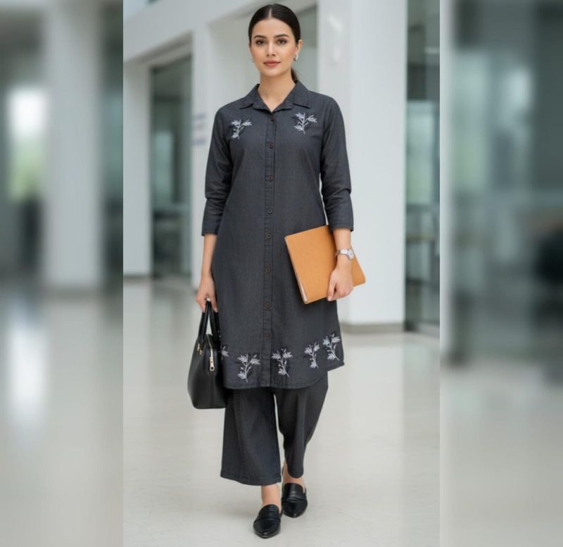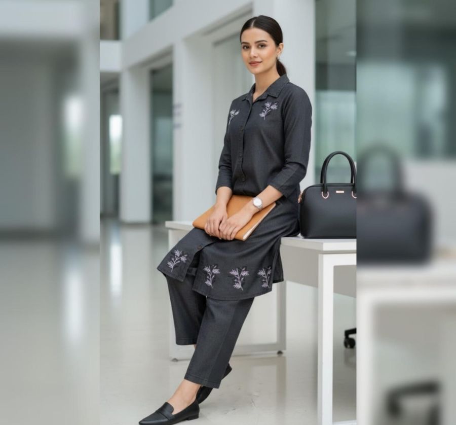 This sophisticated set is designed for the modern woman who values both professionalism and artistic detail. It features a long-line tunic with delicate floral embroidery, paired with matching trousers for a seamless, authoritative look.