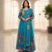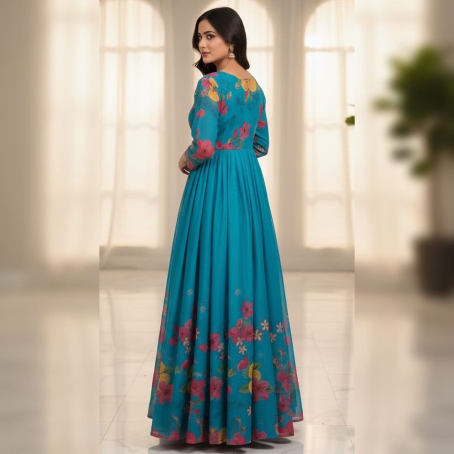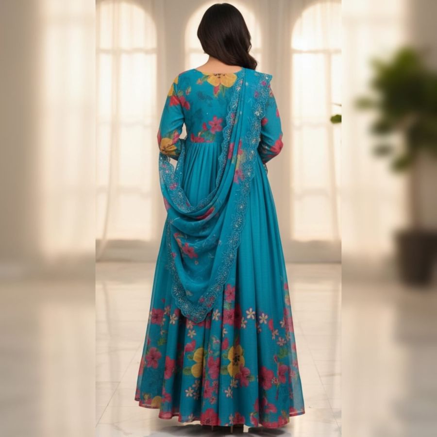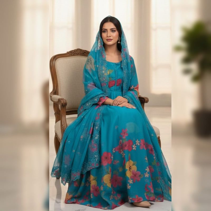 This elegant ensemble features a floor-length Turquoise Blue Anarkali gown crafted from lightweight fabric with a graceful flare. The outfit is adorned with bold, colorful floral prints in shades of pink and yellow. It includes a matching dupatta with intricate lace scalloped borders and delicate floral accents, creating a perfect blend of traditional and contemporary styles.