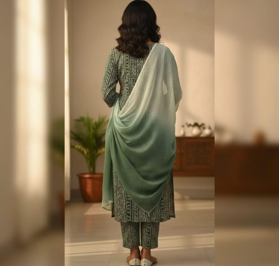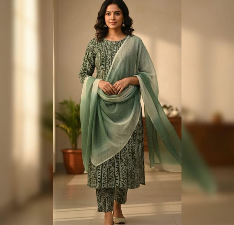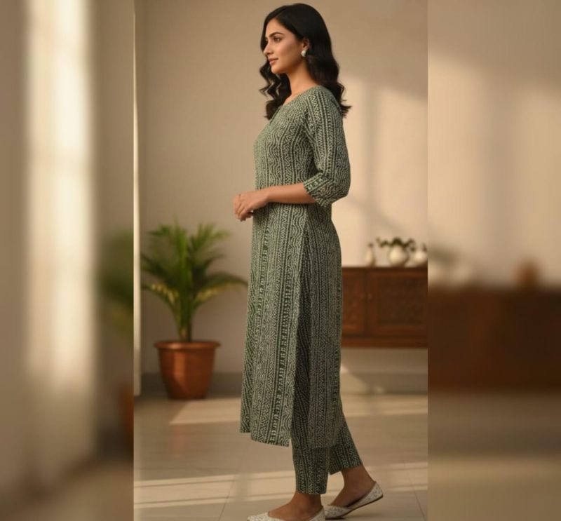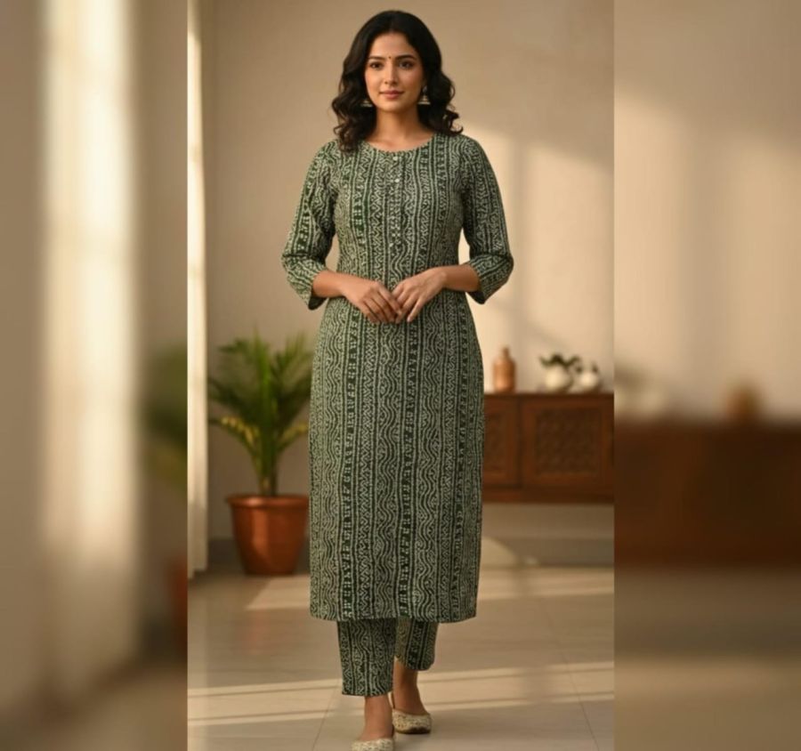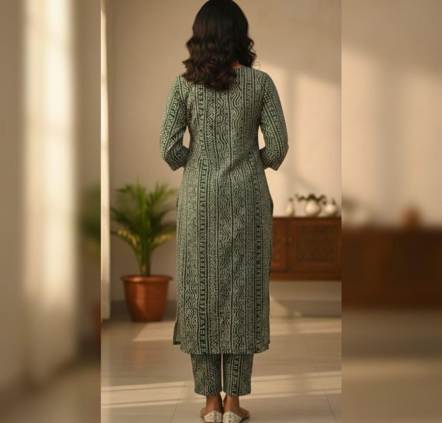 A classic daily-wear set featuring traditional Bandhani-inspired vertical prints. The round neckline and simplified straight-cut trousers offer a comfortable yet stylish look for office or casual outings.